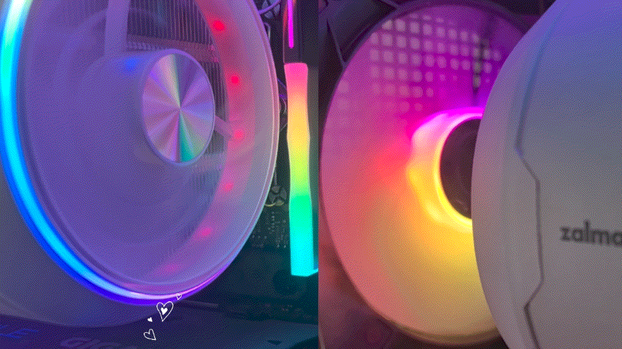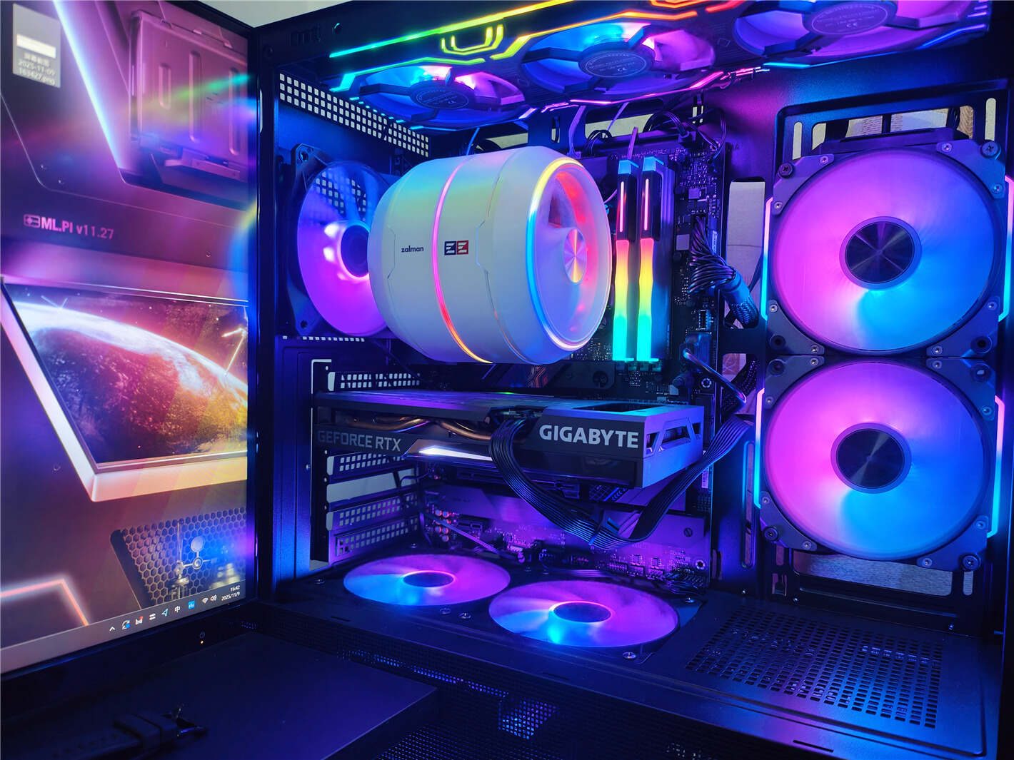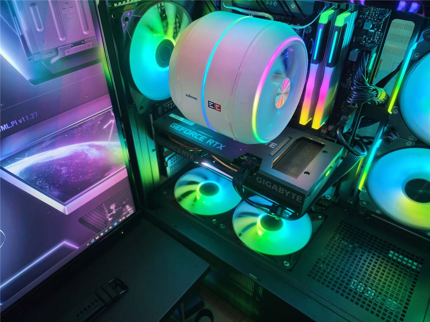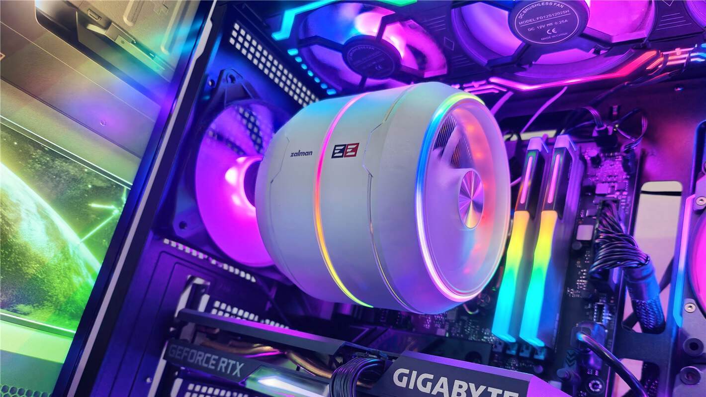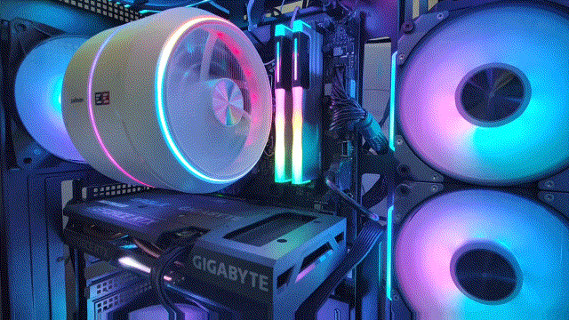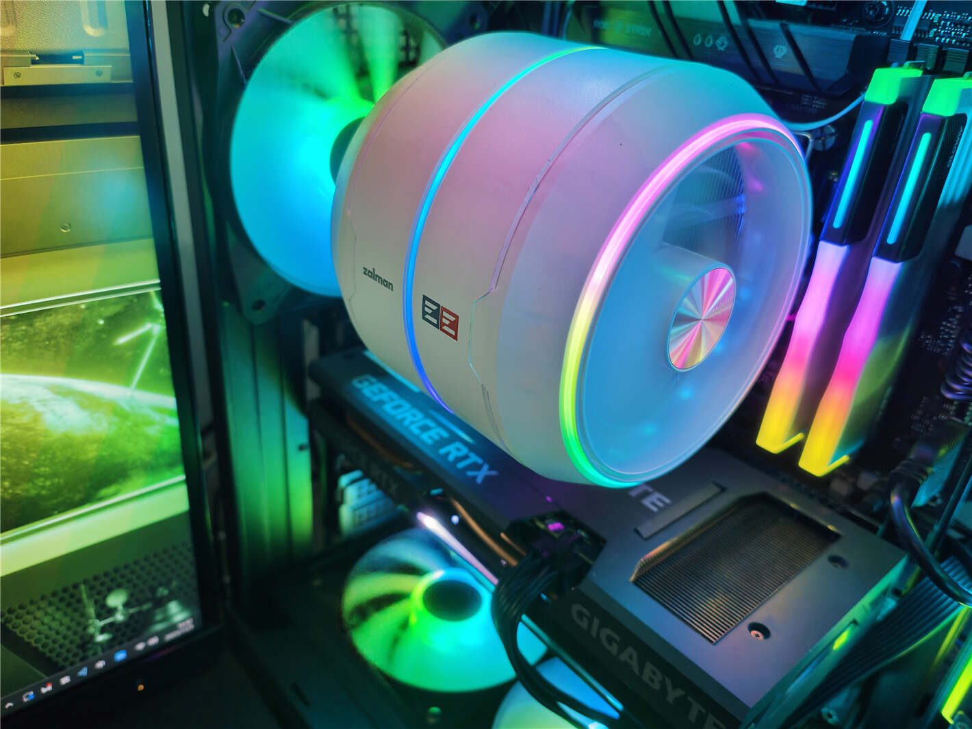 ZET5的另一大特色是其炫酷的RGB光效。散热器上环绕的RGB光环在开启神光同步后,展现出流光溢彩的效果,特别是彩虹光圈模式,让整个机箱瞬间充满动感。