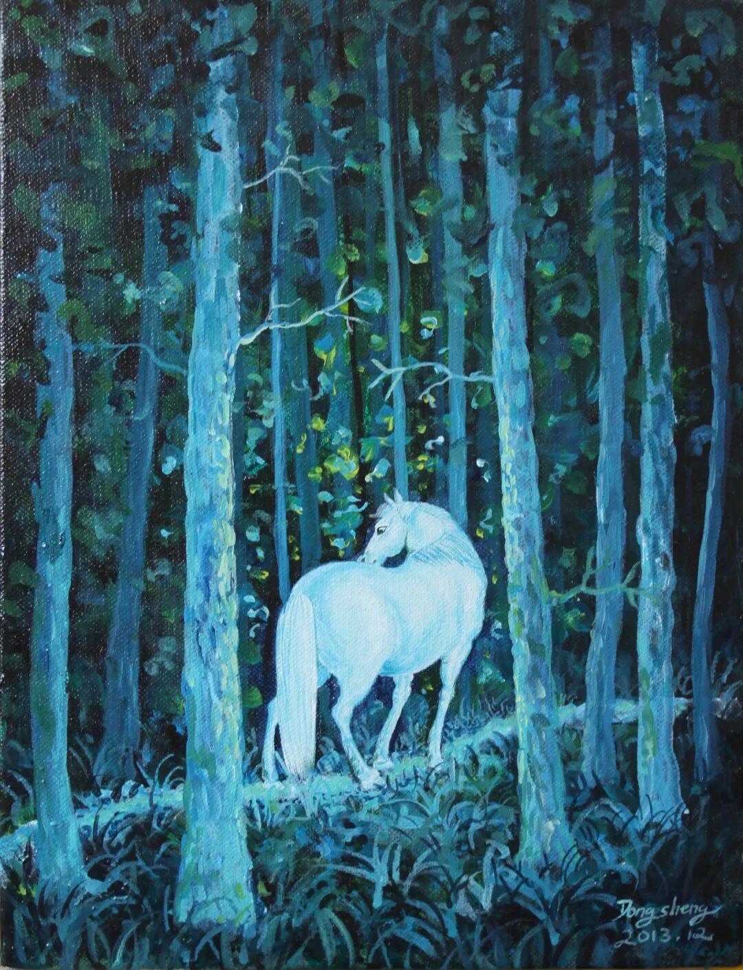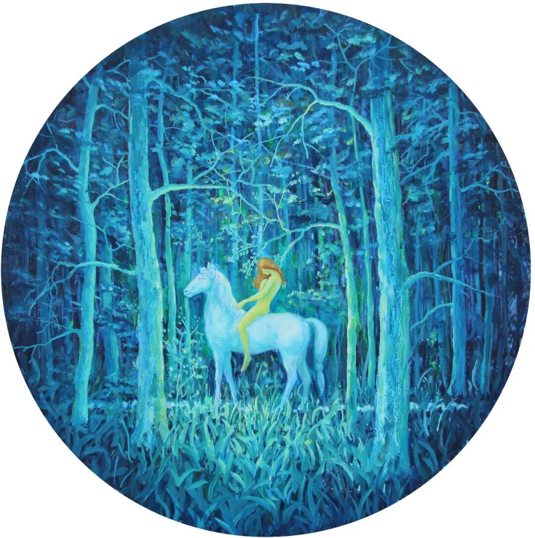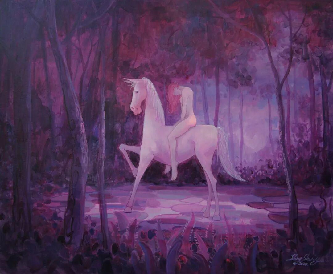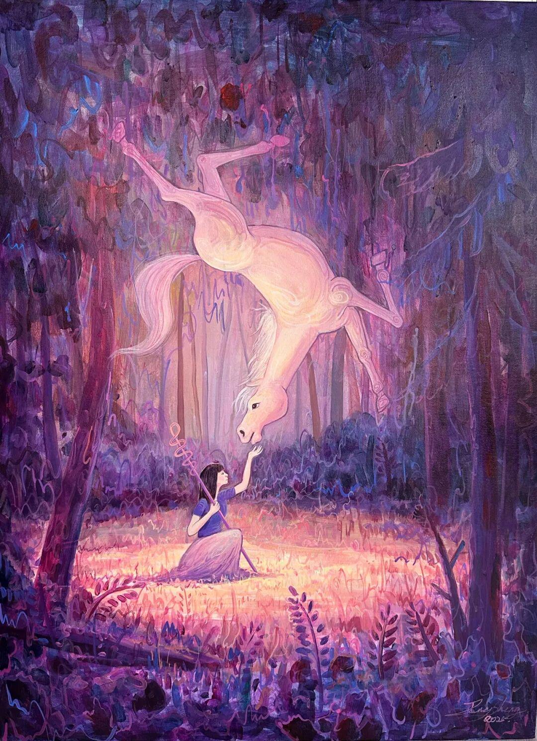 首先是"天人合一"的宇宙观。在朱东升的画中,马不再是孤立的存在,而是与自然、与人、与整个宇宙形成有机的整体。图中白马腾空、少女跪地的构图,暗合了"天地交泰"的易学思想;图中白马与奇幻森林的融合,则体现了"万物一体"的道家观念。这种"物我交融"的意境,正是中国传统哲学的核心精神。