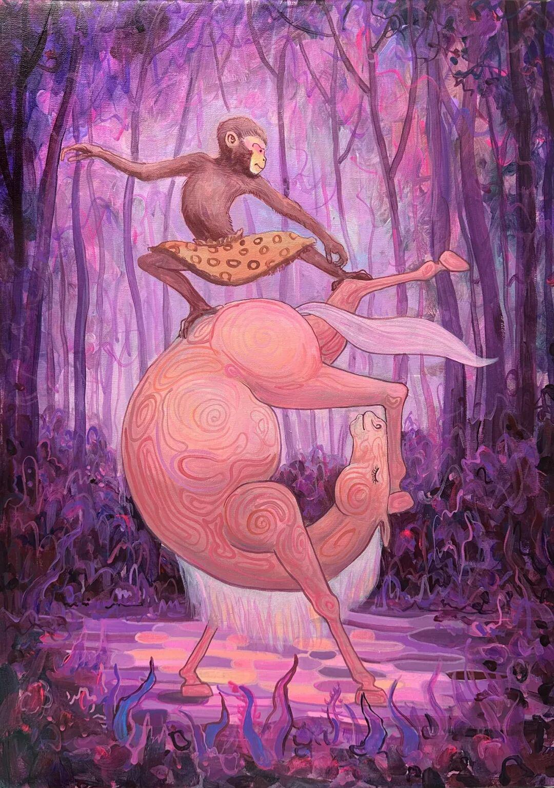 从造型语言看,朱东升的马既不是完全写实的解剖学结构,也不是纯粹抽象的符号,而是介于"似与不似之间"。这种造型观显然受到中国传统写意画的影响——重神似而非形似。但与传统写意画不同的是,朱东升的马在"不似"的方向走得更远,加入了更多的主观变形和想象元素。例如图3中的羊驼与猴子组合,这种荒诞的造型组合,更接近西方超现实主义的"自动书写"理念。