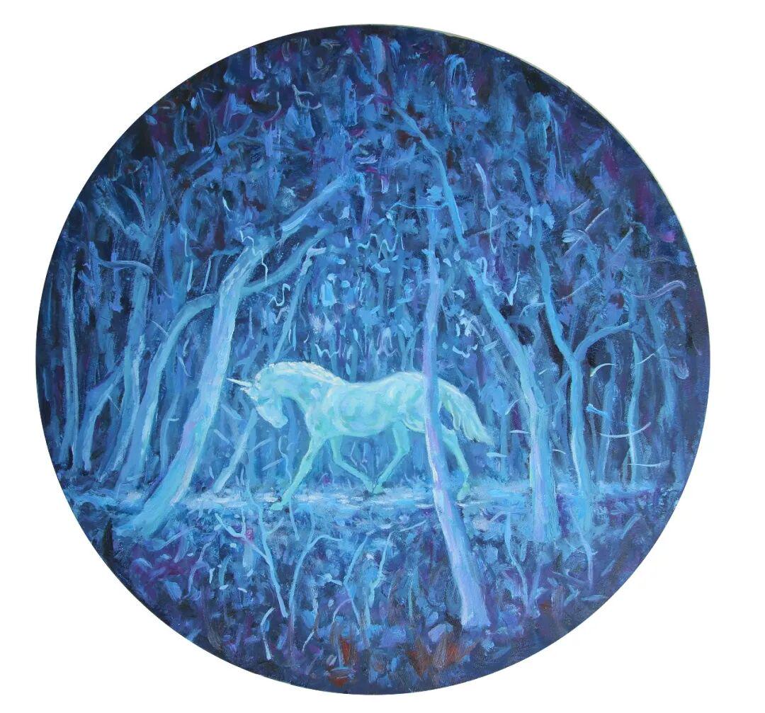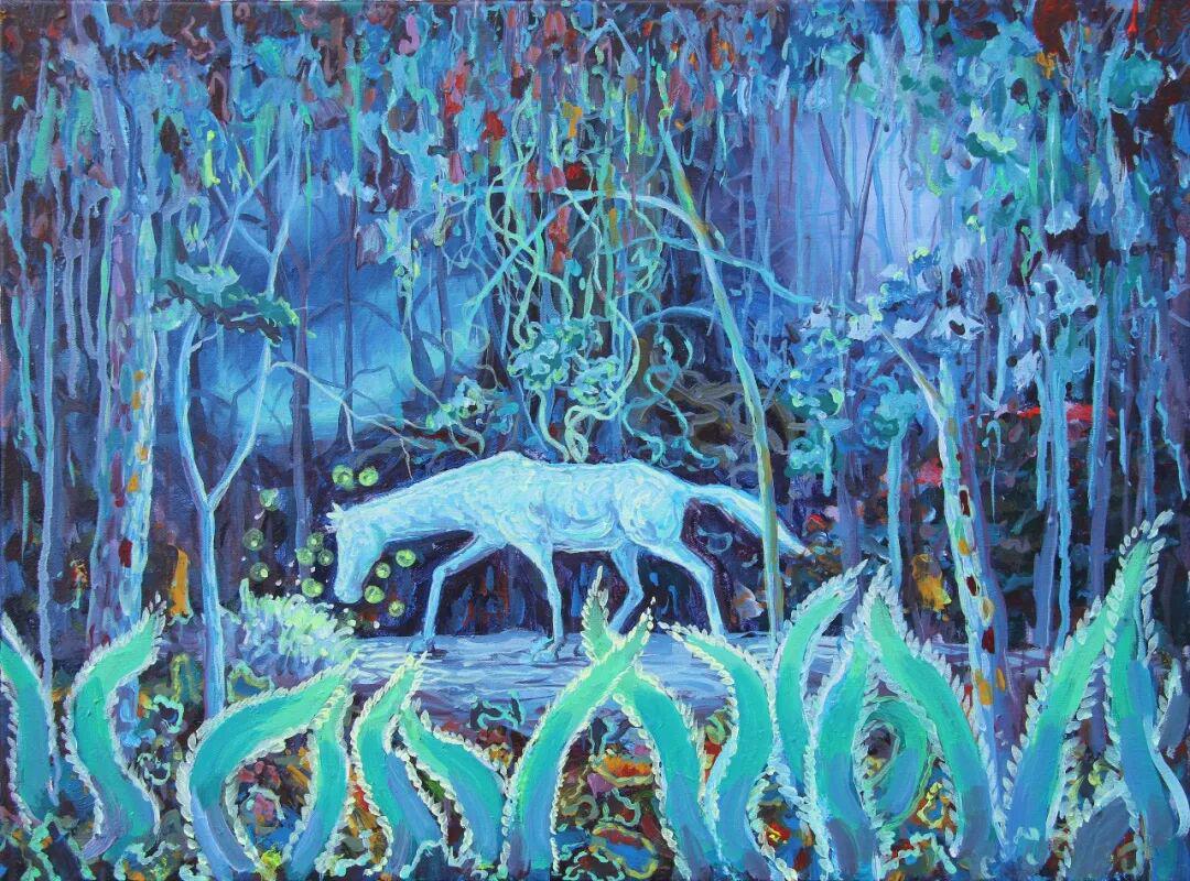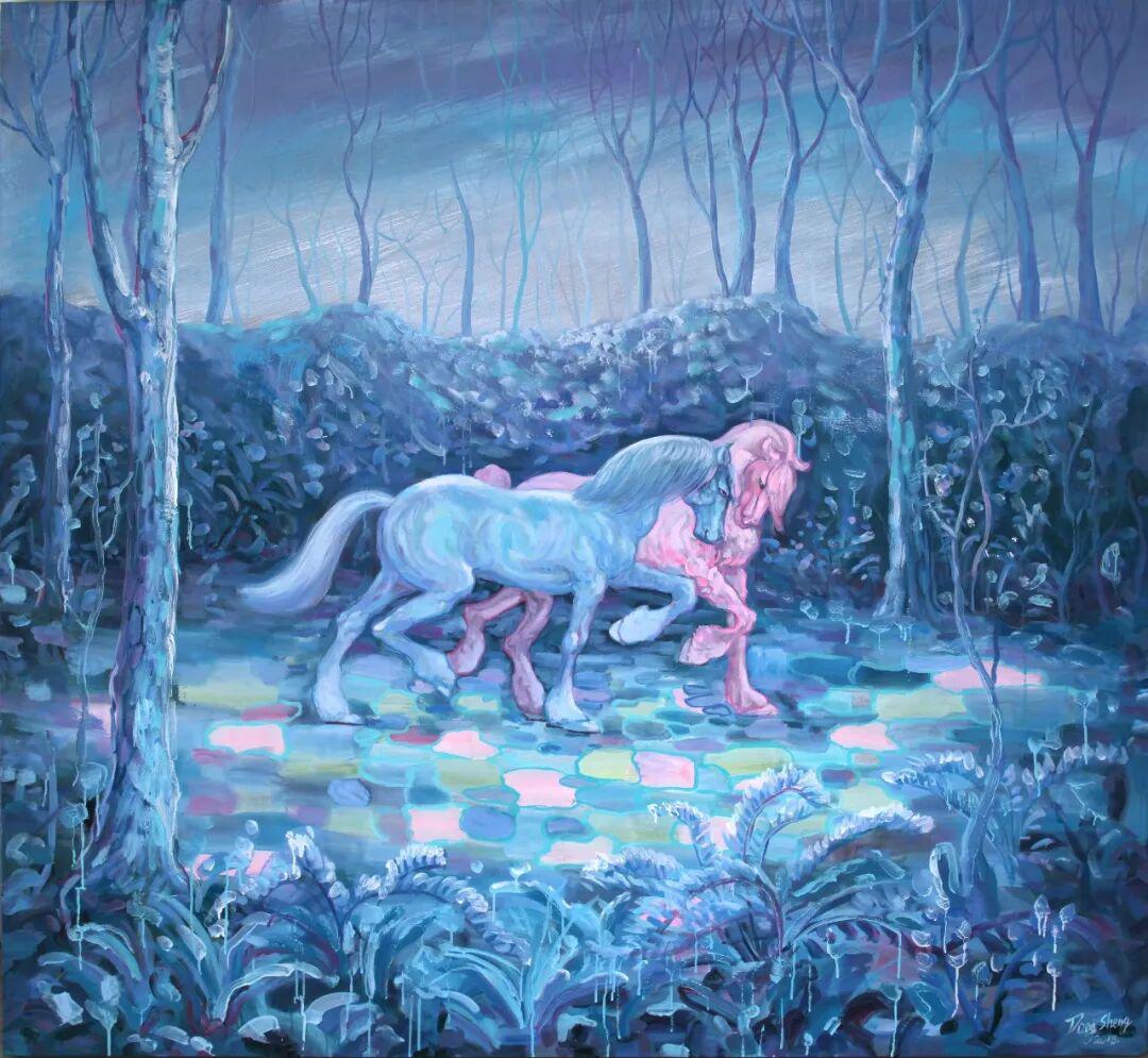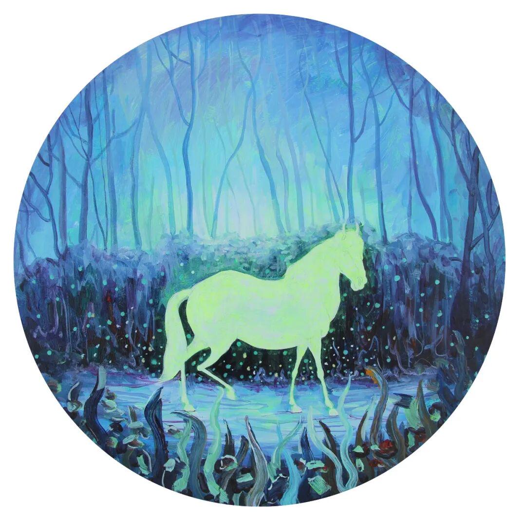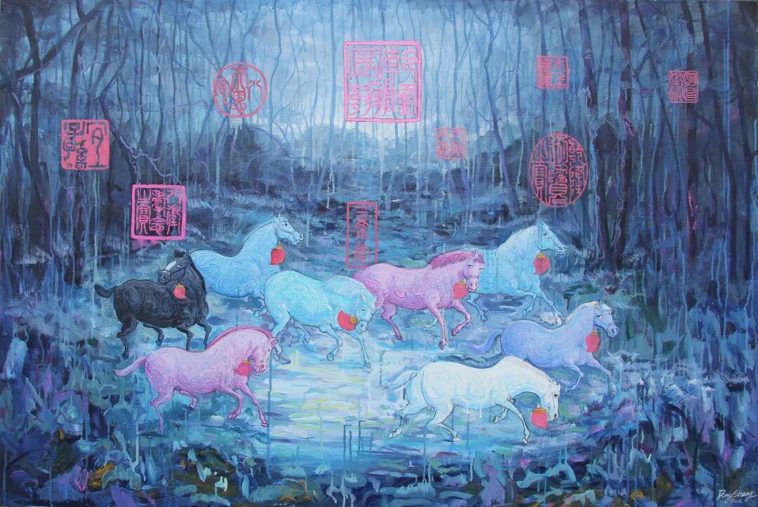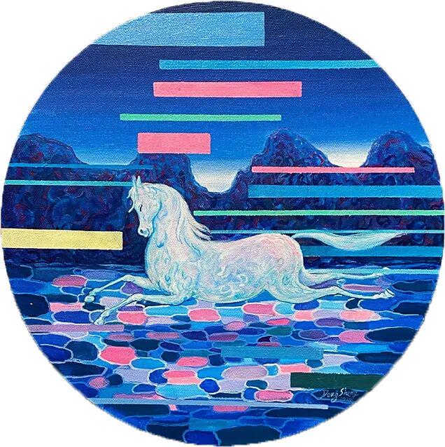 朱东升画马的表现力,主要体现在色彩语言的象征性与笔触的抒情性两个维度。画家大量使用高饱和度的蓝紫色调、粉绿色调,形成强烈的视觉冲击。这种色彩选择并非写实主义的客观再现,而是主观情感的外化。例如在蓝紫背景的映衬下,白色显得格外纯净,而背景的斑斓色彩则暗示着精神世界的丰富性。还有的荧光绿马身,更是将色彩推向极致,这种"非自然色"的使用,强化了画面的超现实氛围,也暗示了马作为精神载体的象征意义。