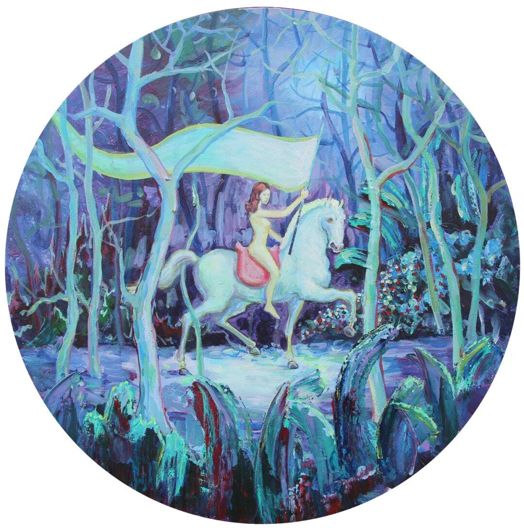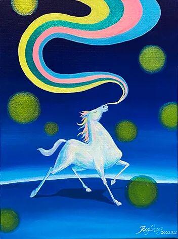 朱东升笔下的马,早已超越了传统动物画的写实范畴,而是以超现实主义的想象力,构建了一个个充满诗意的奇幻世界。画家的创意核心在于打破物象的物理逻辑,重构视觉叙事的新秩序。在《白马与少女》中,白马腾空而起,与跪坐的少女形成奇妙的对话关系,这种"天地对话"的构图打破了常规的透视法则,营造出梦境般的悬浮感。而《仙气儿-马》更是将马的气息进行诗意化改造——从口中吐出的不再是气息,而是色彩斑斓的丝带,这种"物性转换"的手法,让马的形象从现实动物升华为精神符号。最值得玩味的是重构的《八骏图》,画家将传统题材进行当代化演绎,马匹不再是徐悲鸿式的写实骏马,而是色彩各异、形态夸张的意象化形象,背景中的红色印章文字更增添了文化隐喻的层次。这种创意手法,本质上是一种"陌生化"的艺术策略。朱东升通过解构马的常规视觉经验,让观者在熟悉的形象中感受到陌生,在陌生中又体味到某种精神共鸣。这种创意不是为奇而奇,而是为表达更深层的文化思考服务。