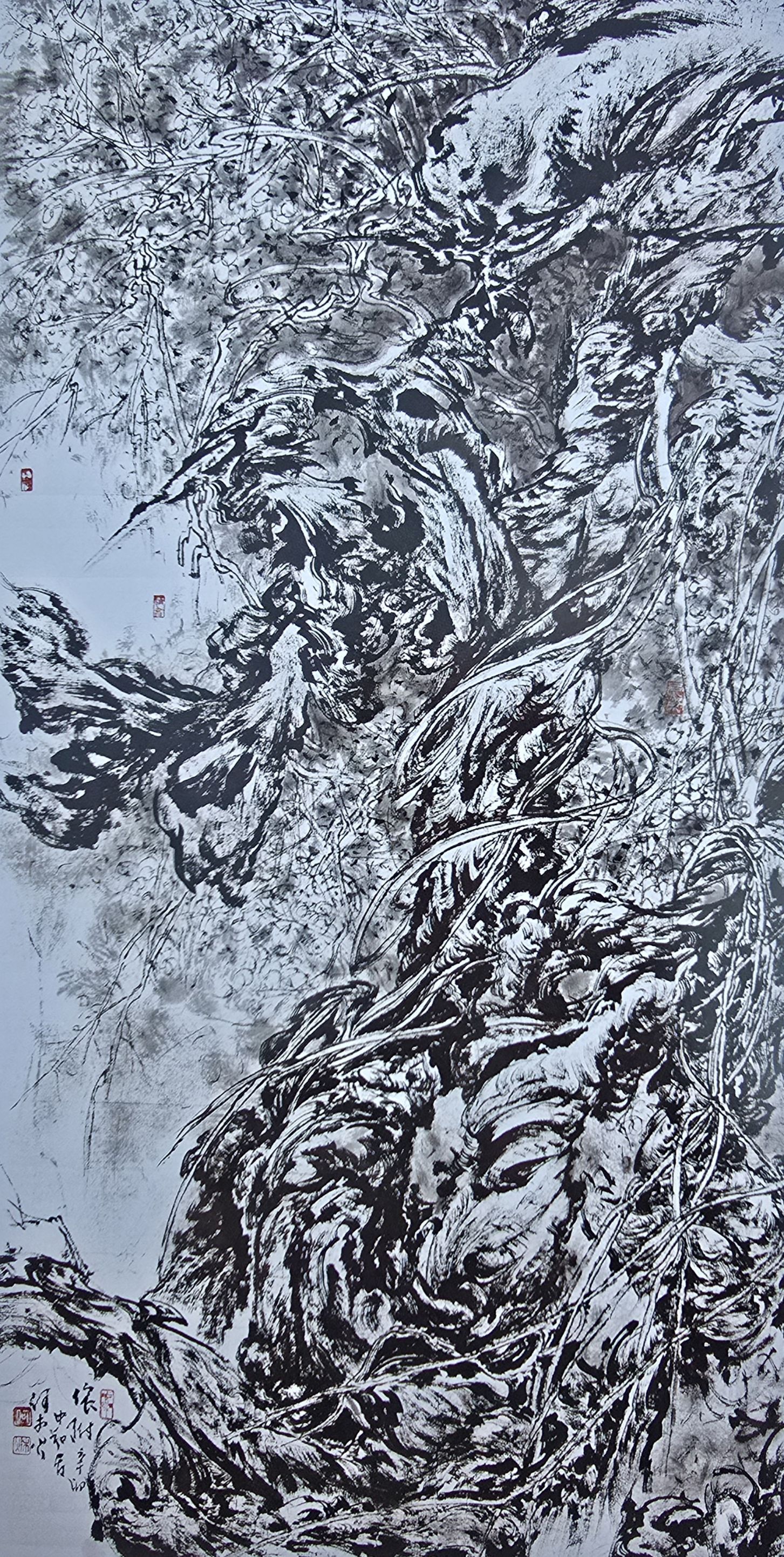 何木火创造的「龙形流风」美学,让观者在静止的纸面上感受到巨龙苏醒、蓄势待发的动态瞬间。他的画面中,山不是山,是盘踞的龙脉;水不是水,是游走的龙形;云不是云,是巨龙吞吐的气息。