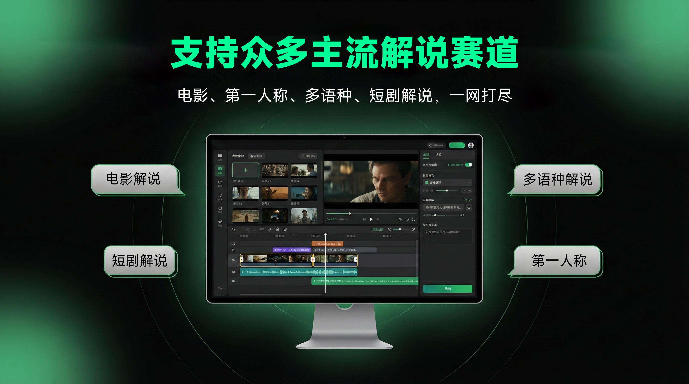 支持格式: 覆盖 短剧解说、长电影解说、第一人称沉浸式解说 以及 多语种出海解说。