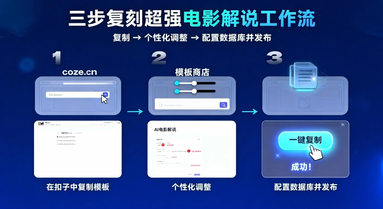 第一步:获取Coze模板 访问Coze官网模板商店,搜索关键词 “AI电影解说”,找到并 【一键复制】。