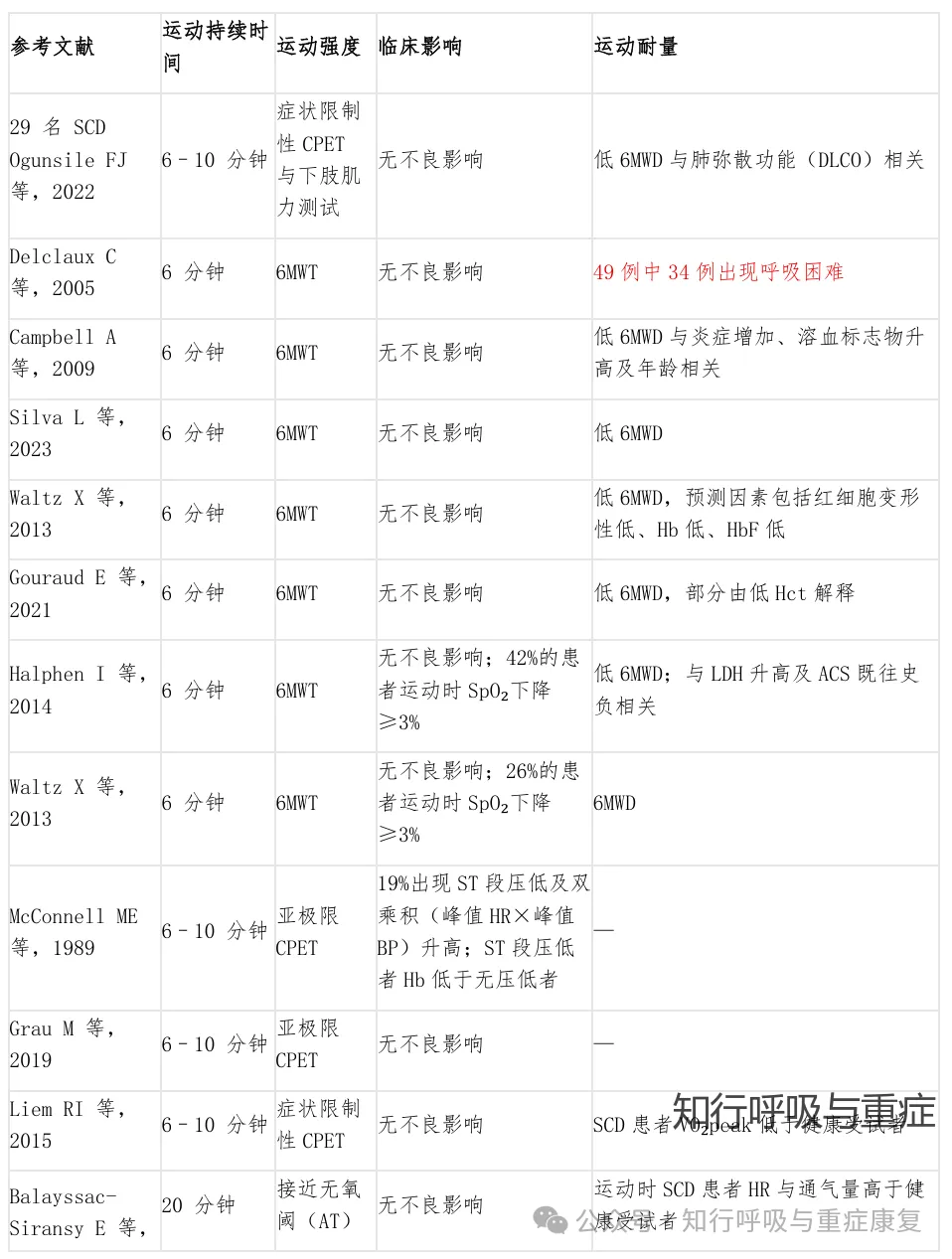 正是因为贫血发生原因复杂多样,目前贫血患者运动训练的相关安全性研究结果尚存争议,在一项关于运动训练项目对镰状细胞病(SCD)患者生理学及临床影响系统综述中,急性运动(如症状限制性心肺运动试验 CPET)总体安全,SCD患者在严密监控下进行一次性或短期的极限/次极限运动测试,不良事件发生率很低(<4%),主要包括:心电图异常占2%、需住院治疗的疼痛占0.1%、无需住院的疼痛占0.3%、运动诱发的低氧血症(即运动中血红蛋白血氧饱和度下降≥3%)占1.1%。