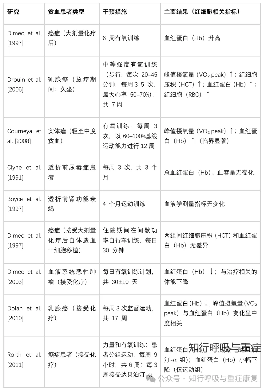 目前运动训练被认为是一种安全、经济且有潜力的辅助改善贫血的手段。然而,不同类型贫血中运动训练的有效性,以及其最佳模式、强度和频率(尤其是力量训练),仍需进一步研究。