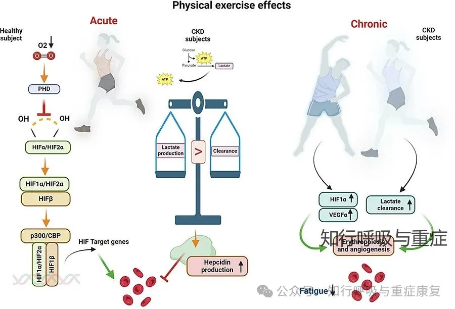 从目前的证据。缺氧诱导因子 HIF-1α 和 HIF-2α 在正常情况下被脯氨酰羟化酶(PHD)羟化,随后通过多泛素化途径在蛋白酶体中降解。急性运动可模拟缺氧环境,抑制 PHD 活性,使 HIF-α 稳定并转位入核,与 HIF-1β 二聚,招募转录共激活因子 p300 和 CBP,结合靶基因上的缺氧反应元件(HREs),激活 促红细胞生成素(EPO)及铁代谢相关基因。长期规律运动可提高 HIF-α 和血管内皮生长因子(VEGFα)水平,从而通过刺激红细胞生成和改善骨髓微环境,对贫血具有潜在改善作用。