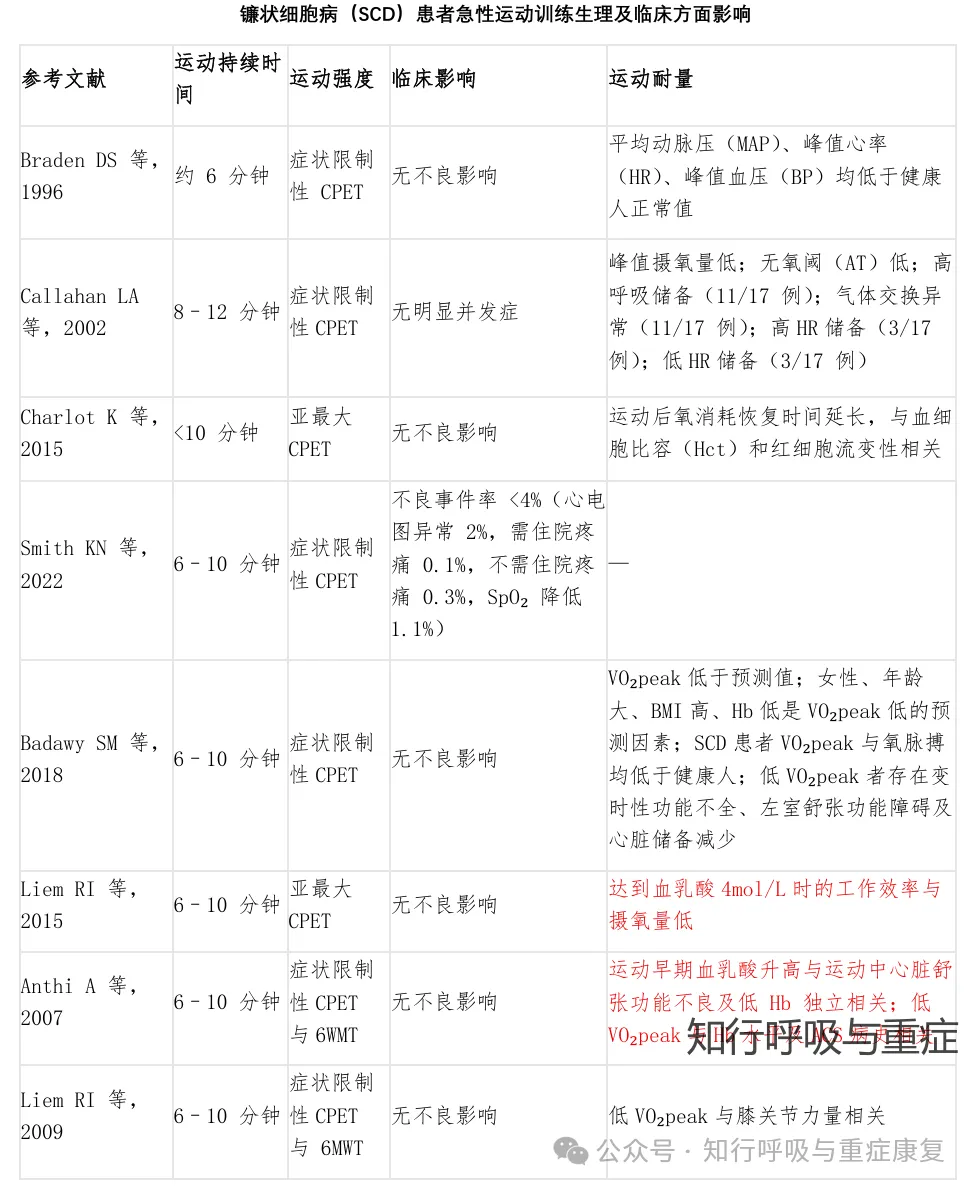 在接近无氧阈(AT)的 20 分钟中等强度运动中,SCD患者与对照组均未出现不良反应;数周至数月的规律中等强度耐力训练也未报告严重不良事件,反而改善了肌肉微血管结构、提高了部分心肺功能指标,且未增加疼痛危象或住院率。但运动诱发的 SpO₂下降在某些患者(尤其是儿童与青少年)中较常见(26%–42%在 6MWT 中出现 ≥3% 的下降)。因此对于此类患者,在医学监督、循序渐进、强度控制的前提下,急性运动测试和规律的中等强度训练对大多数 SCD 患者是安全且可耐受的。
