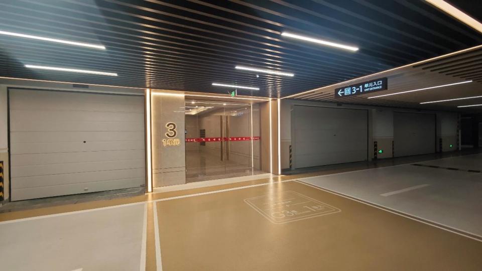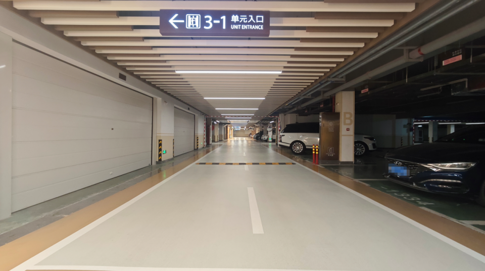 地下车库公区装修在线,主干车道还做了格栅吊顶,如果在进出通道内的墙面上,做一些装饰就更好了,现在略显单调。