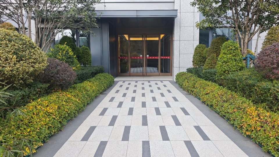 和传统大门不一样,栢悦轩北门用石材景墙做了简约的围合立面,把入口隐藏在景墙后,结合沿市政道路的涌泉景墙和中央的艺术雕塑,营造了静谧又高级的氛围。