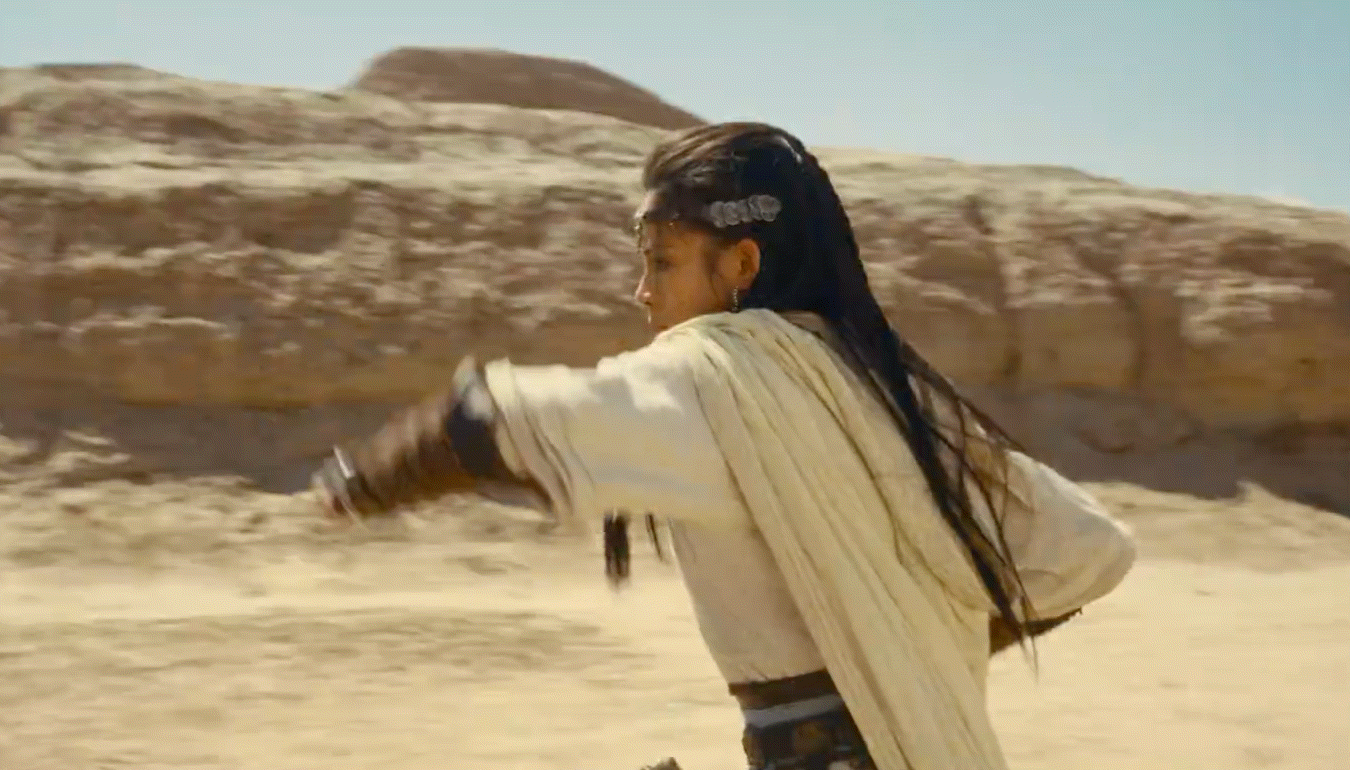 她身披大漠白衣,策马狂奔在黄沙漫天的戈壁上,裙摆飞扬,发丝凌乱,却难掩眼中的坚定。