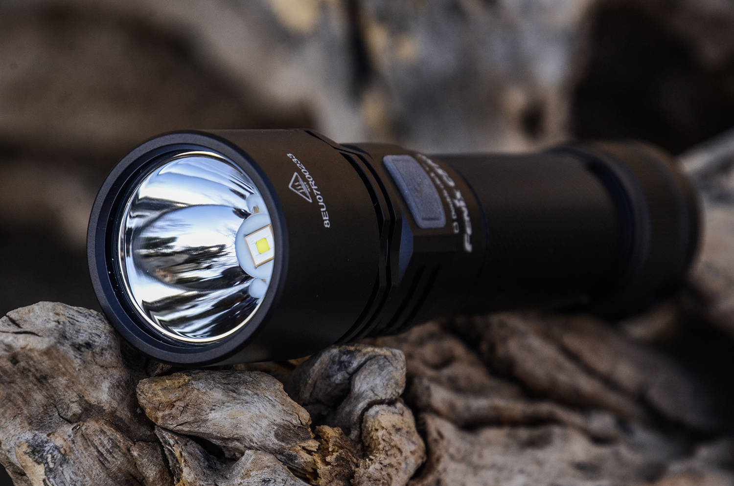筒身表面采用黑色军规HAIII级氧化,有效保护手电外壳,筒身表面采用白色镭雕印字,黑底白字清晰可见,从灯头的防烫标到灯颈的商标再到底部的CE质保都非常清晰,这就是FENIX的品质保障。