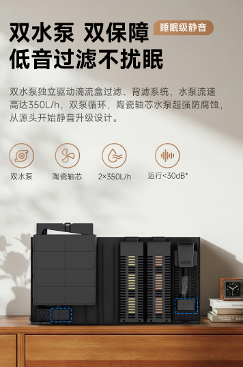 它的躯壳之内,潜藏着一颗堪比超跑的双核水泵心脏,爆发出澎湃动力,驱动着高达6500mL的巨构级过滤系统。这意味着,这座微缩海洋中的每一滴水,都在以惊人的频率被反复冲刷、过滤、净化、增氧,最终再被温柔地释放回生态循环。
