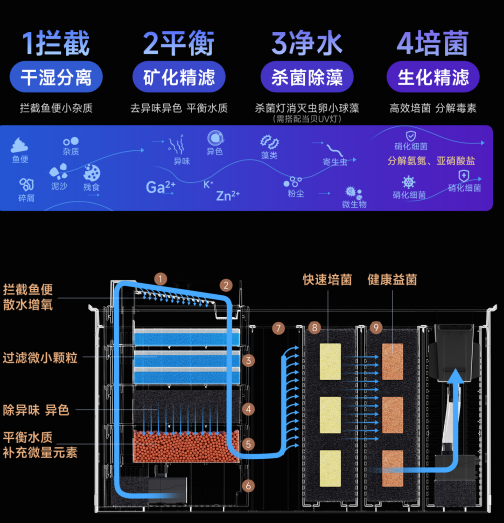 主动式水质净化: 专利级UV-C紫外杀菌矩阵与生化系统深度耦合,在你的肉眼察觉到水质恶化之前,AI早已完成了一场微观世界的“净化战争”。它24小时不间断地扼杀藻类孢子与有害病菌,将清澈从一种“追求”,变成一种“理所当然”。