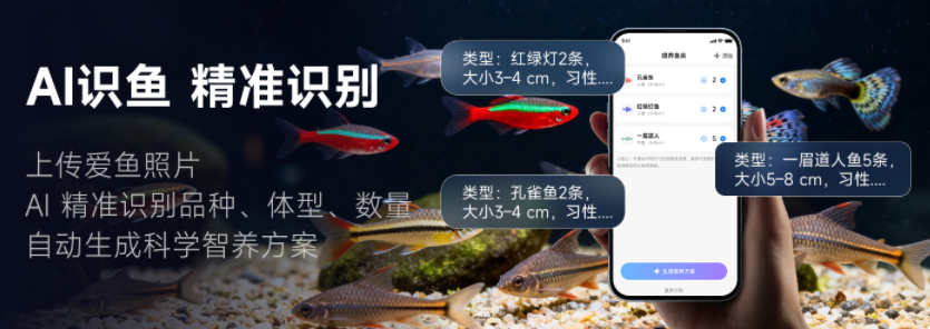 AI慧眼识万物: 无需你费心查阅任何资料。开箱,注水,放鱼。只需用手机对准这方天地,AI便可在瞬息之间识别万千水族物种,并从云端调取由全球生物学家与水族大师共同构建的庞大数据库,为你的专属生态生成一份精确到毫秒的“生存法则”。