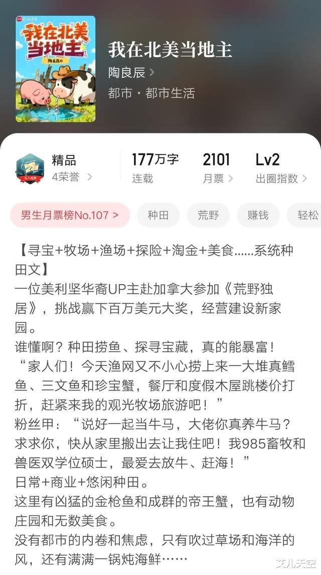 陶良辰多写美利坚背景的种田文,之前也多是精品成绩,到这本北美地主算是更进一步了。