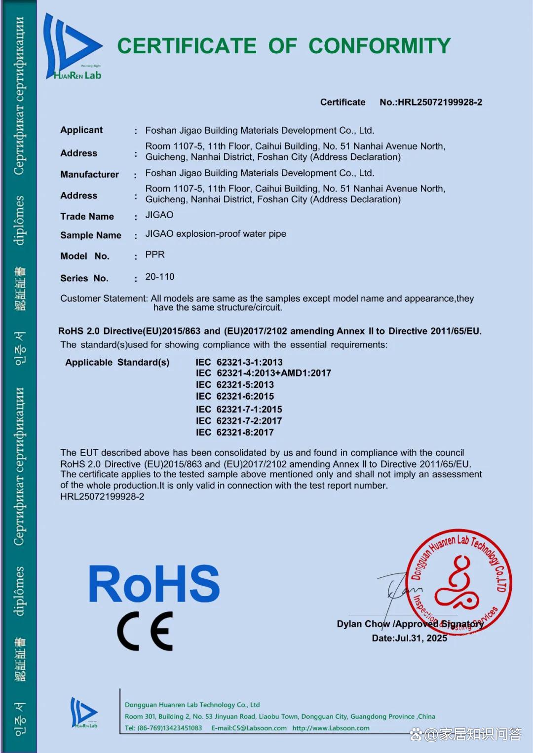 3. ROHS欧盟无铅认证:绿色健康的“承诺” 该认证要求产品严格限制使用铅、汞、镉等有害物质。极高防爆水管通过此项检测,意味着产品无毒、无害、绿色环保,无论是在生产、使用还是废弃过程中,都不会对人体健康和自然环境造成危害,体现了企业对消费者和社会的深切责任感。