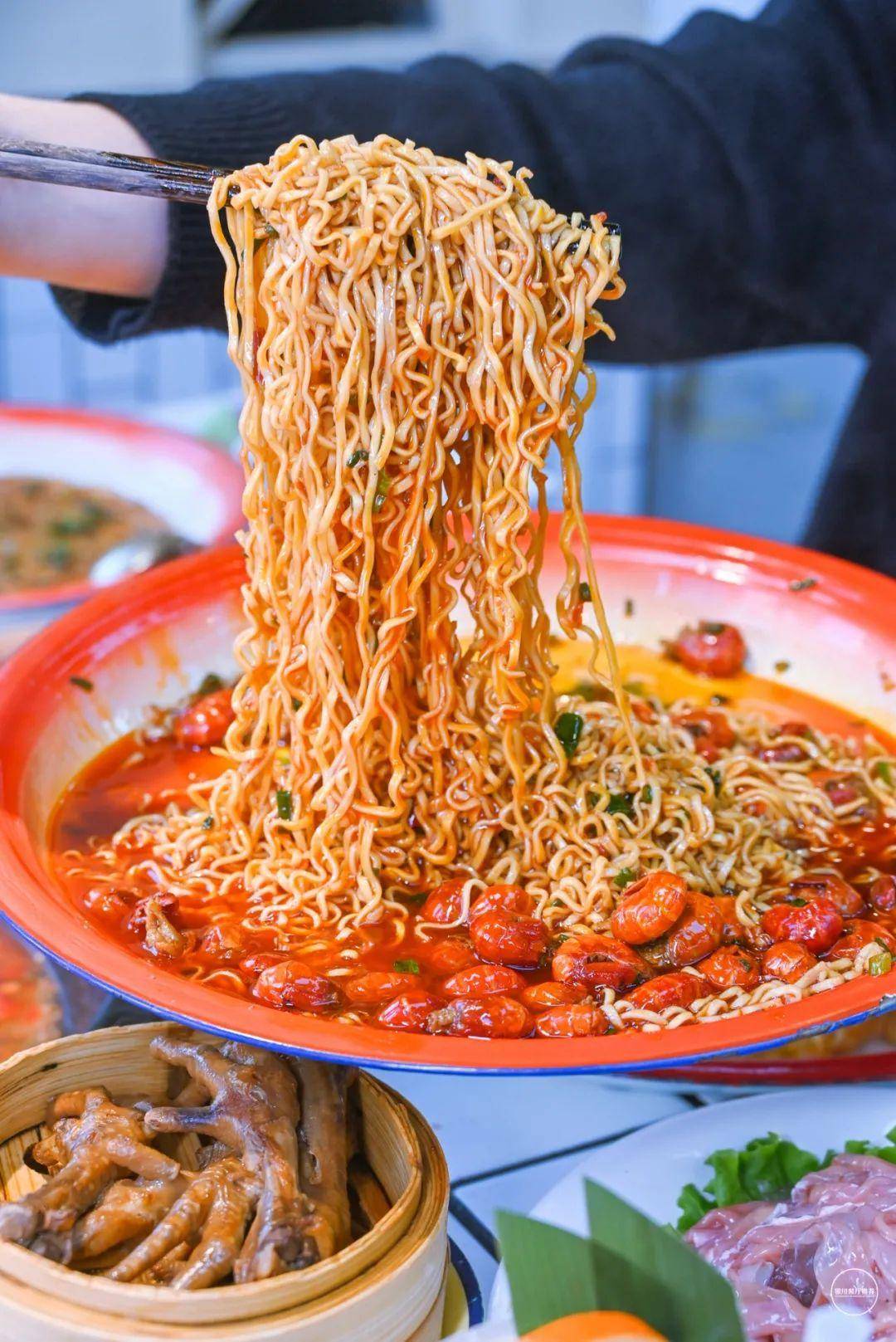 虾尾在吮吸的过程就感受到了卤味的奇妙,麻辣悠长。而火鸡面则真正的遇到了最新的打开方式,爽滑吸溜,停不下来。