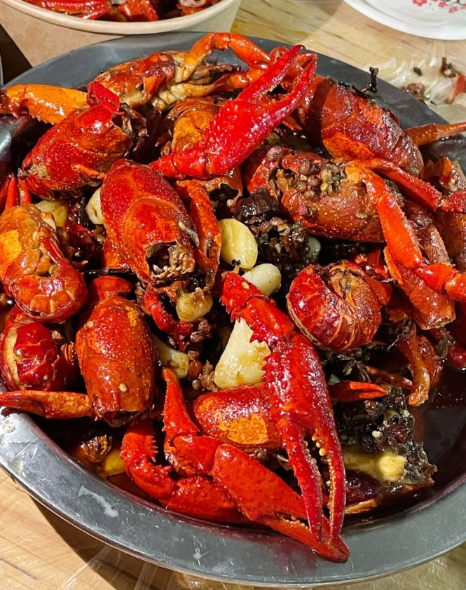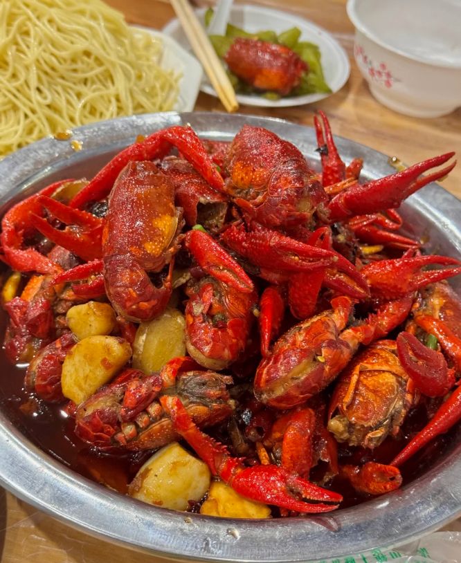 吃虾,必须用手,这是仪式感的一部分。戴上手套,捏住虾身,先吮吸一口壳上的汤汁,那咸、鲜、香、辣、麻、甜交织的复杂滋味瞬间引爆味蕾。然后剥开虾壳,露出饱满弹牙的虾肉,蘸一下盘底的汤汁,整只送入口中,满足感无以复加。虾黄更是精华所在,鲜美醇厚。人们围坐一桌,双手忙碌,唇舌交战,汗水与欢笑声齐飞,所有的拘谨都在这一刻卸下。吃完虾,再将煮好的碱水面倒入剩余的汤汁中拌匀,让面条吸尽精华,是这场盛宴最圆满的收尾。潜江的夏夜,就沉浸在这火红、热烈、畅快淋漓的江湖滋味里。