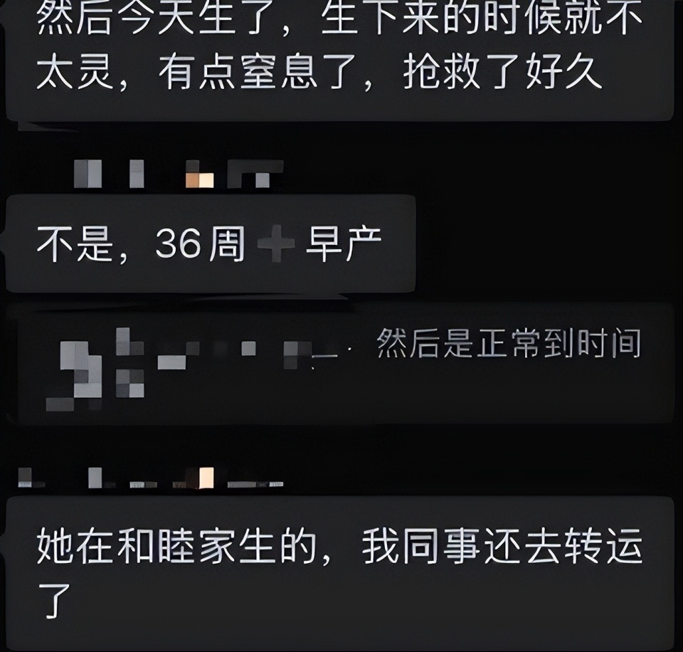 这是几张聊天记录的截图,上面的消息称她生产当天,孩子有点窒息,抢救了很久,而且是早产儿。