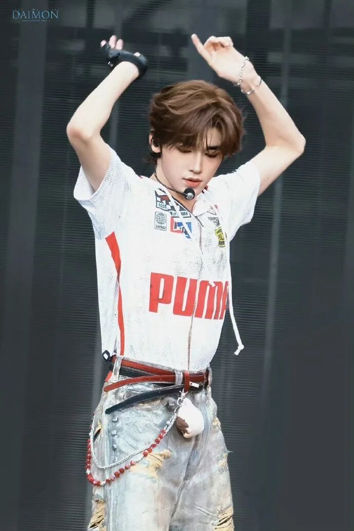 破洞是 “浅度的松弛柔”,不是烂大街的夸张破,做旧的肌理衬着舞台的随性;裤型是 “利落的窄脚劲”,没垮成软塌的堆堆裤,利落的线条托着上身的锐,随性没变成 “散的懒”,反而和活力撞出平衡。第三重平衡:茶棕的甜,衬着造型的酷