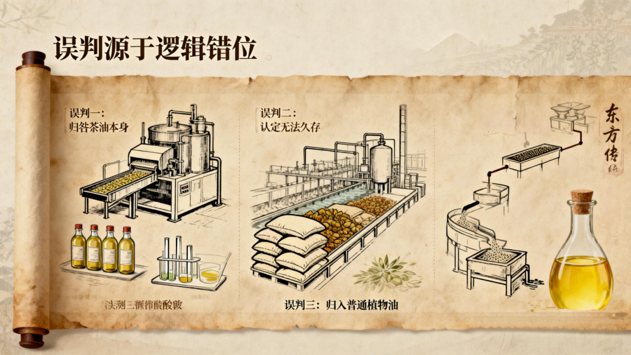 第一重误判:将未经熟化的生茶籽酸败归咎于茶油本身不稳定,认定其为低品质油;