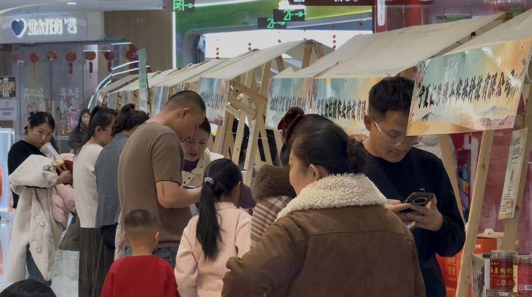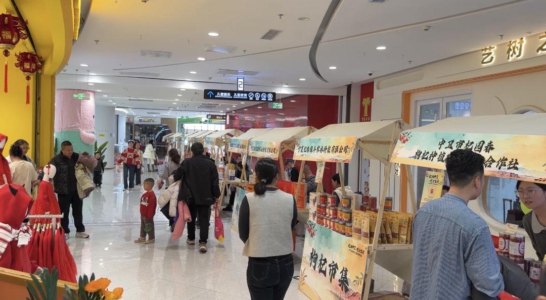 市集位于万达广场一楼大厅,近20家本地枸杞企业集中展出枸杞干果、原浆及多品类的深加工产品。各展位前咨询、试吃、选购的市民络绎不绝,反映出消费券政策与实体展销相结合的模式取得明显成效。
