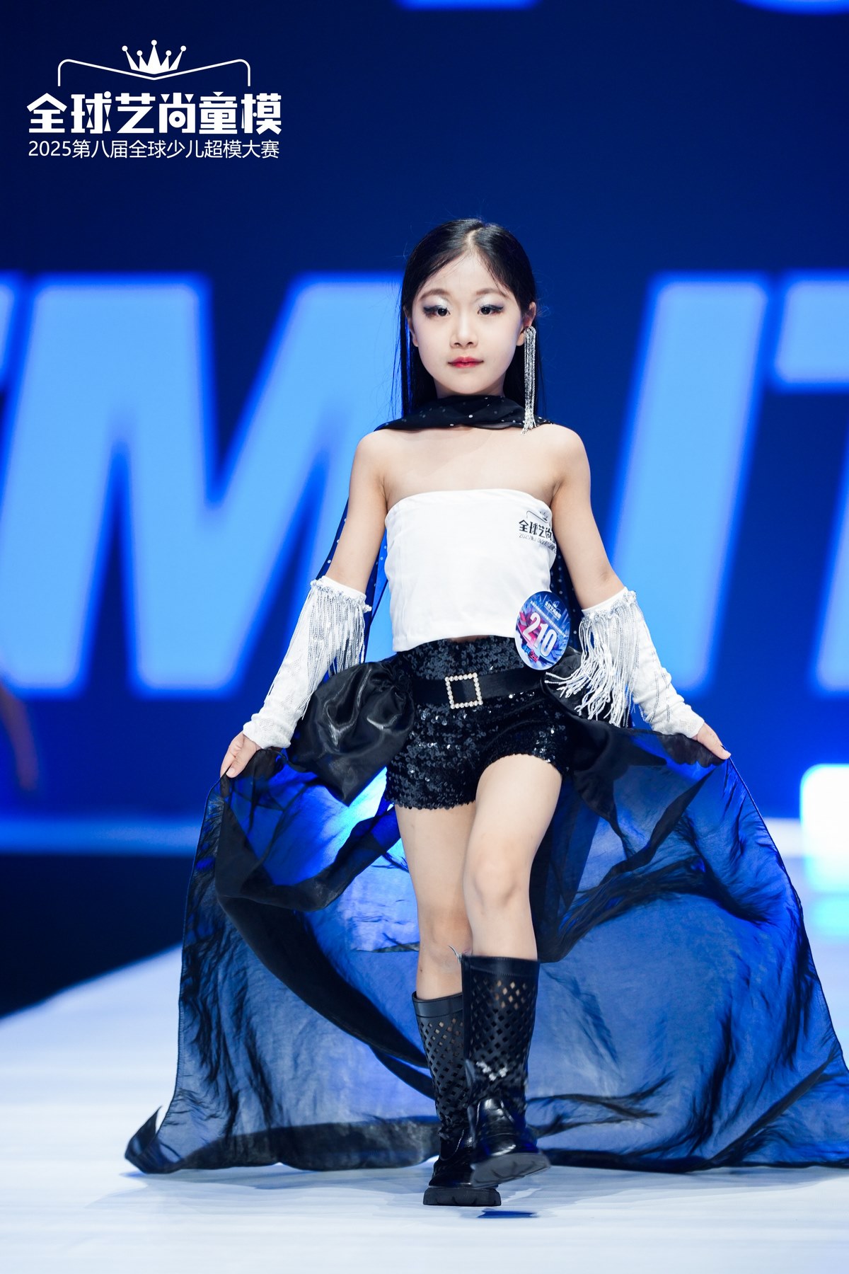 仿佛有位时尚小精灵,把巧思化作魔法丝线,精心编织出这身造型。小超模沈佳桐穿着满是创意的黑白搭配服饰,自信迈步时,每一处流苏轻摆、每一寸面料起伏,都像在舞台上跳着灵动的创意之舞,要为这场大赛绘就一幅融合甜美与潮流的梦幻画卷,让巧思如繁星般在舞台肆意闪耀。