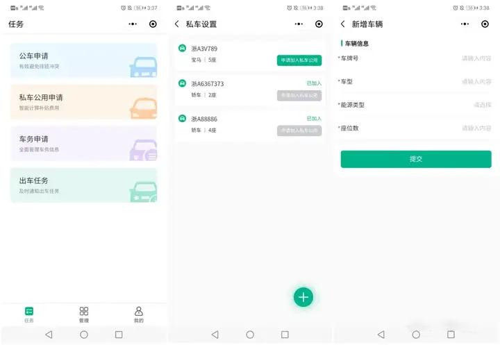 首先,在车智管小程序上,员工可以填写自己的车辆的各项信息,申请将自己的车辆加入私车公用模式,在对应管理员审批通过之后,私车车辆信息成功进入管理系统后台,员工在后续使用时才可进行申请和记录。