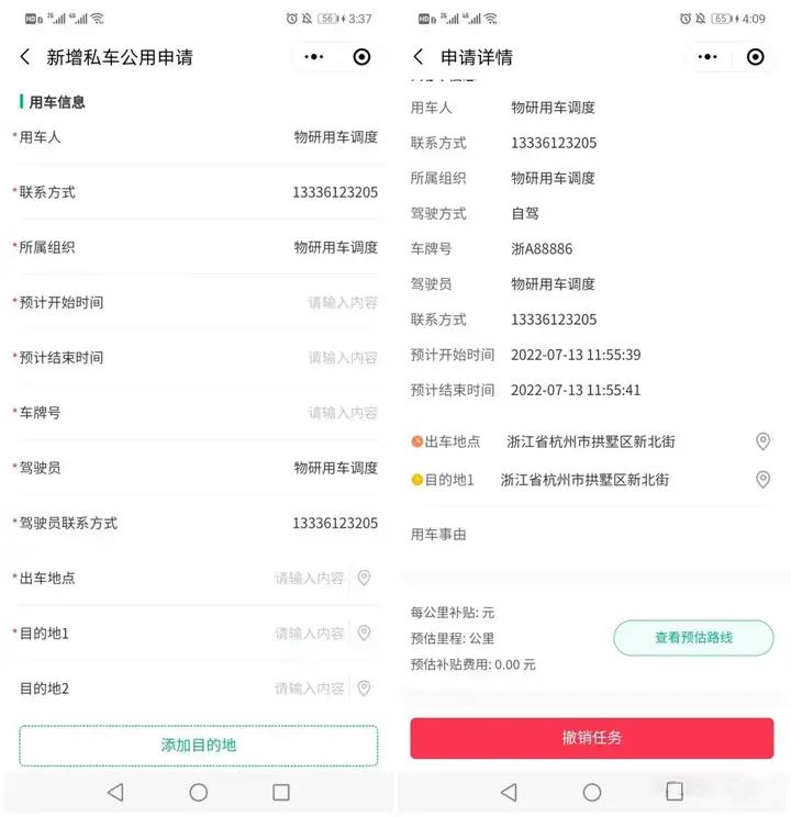 需要私车公用时,员工可在小程序上进行申请,并详细填写本次用车信息,包括用车人、用车事由、预计时间、出发地、目的地等,经过管理员审核批准之后,才能进行本次出车任务,获得相应的补贴。