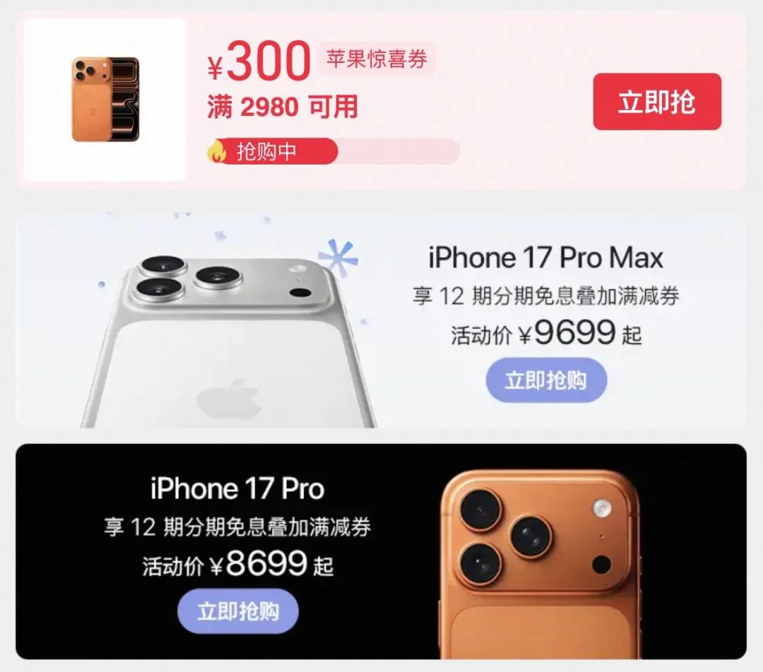 领券即可立减300元,券后iPhone 17 Pro降至8699元起,而iPhone 17 Pro Max则将至9699元起,降价力度和双11保持一致。