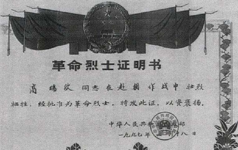 还要补充的一件事是:其实在高瑞欣牺牲两周年之日,也就是1952年11月25日,中国人民志愿军司令部与政治部联署给河北省安国县石佛镇高瑞欣之弟高子刚发出了“革命军人牺牲证明书”。直到1997年4月,高子刚联系上侄女之后,才把证明书转给了高瑞欣的遗腹女高彦坤(杨彦坤)永久保存。