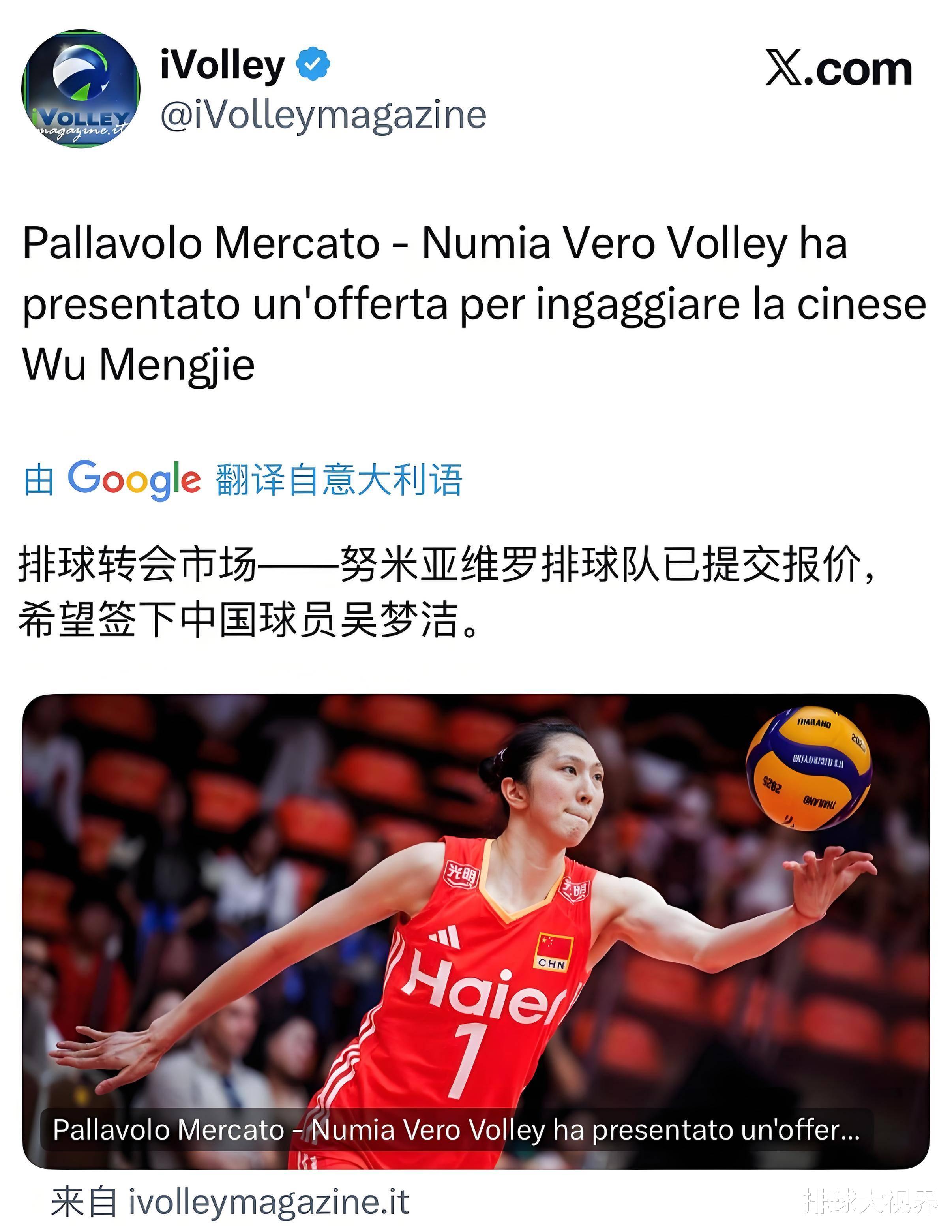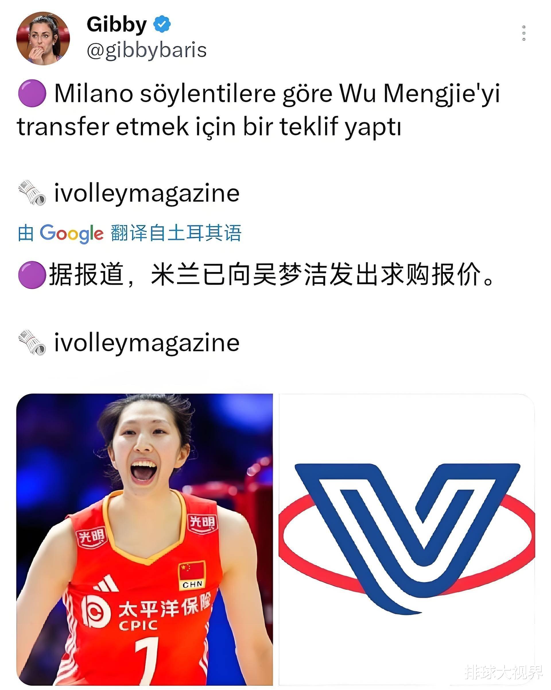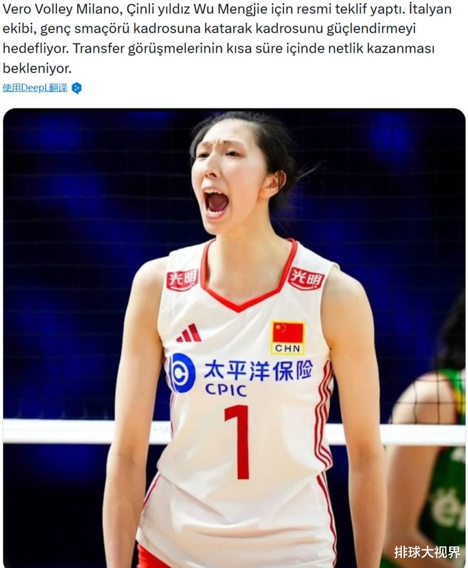 Italian media outlet ivolleymagazine reports that Milan Women's Volleyball Team, having failed to sign Li Yingying, has again made an offer for Chinese women's volleyball team outside hitter Wu Mengjie, hoping to strengthen their squad. The transfer negotiations are expected to conclude soon.