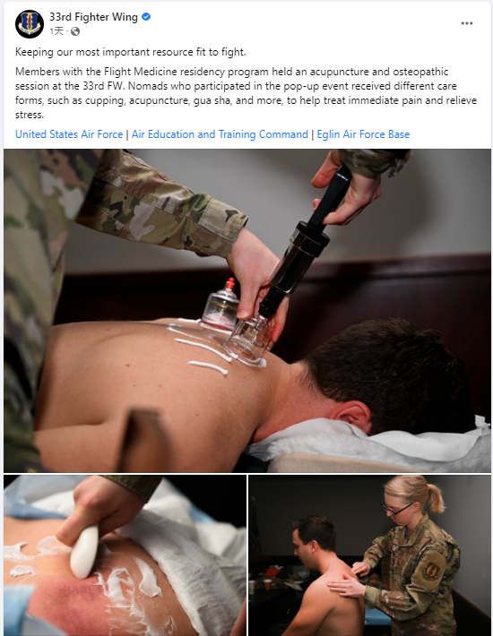 中医疗法在美军大受欢迎,士兵尤喜拔火罐、刮痧、针炙4月15日,驻扎在美国佛罗里达州埃格林空军基地的美国空军第33战斗机联队的官方Facebook帐户发布了一组照片,显示基地人员接受了一次中医和美式整骨疗法的治疗活动,贴文说,活动中展示的中医护理形式有多种,包括针灸、拔罐、刮痧等,目的是帮助治疗军人的即时疼痛症状和缓解日常压力。