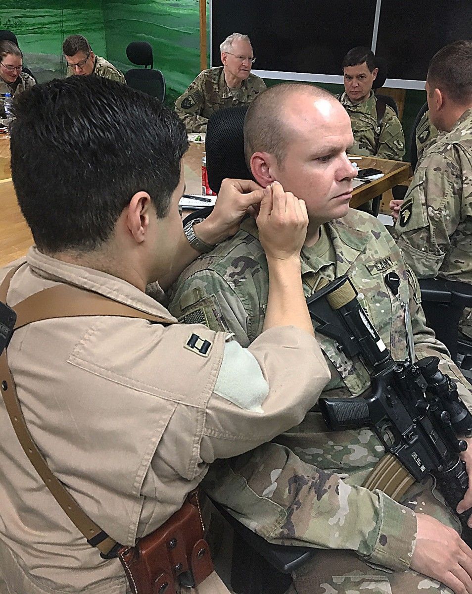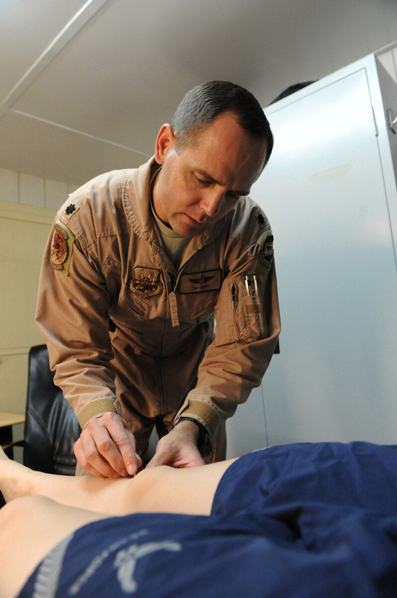 ▎伊拉克巴拉德联合基地,第 4 远征战斗机中队飞行医生蒂姆·达菲中校(博士)正在为飞行员进行针炙,缓解疼痛与疲劳。飞行员无法服用类阿片药物止痛,而针炙解决了他们的问题。