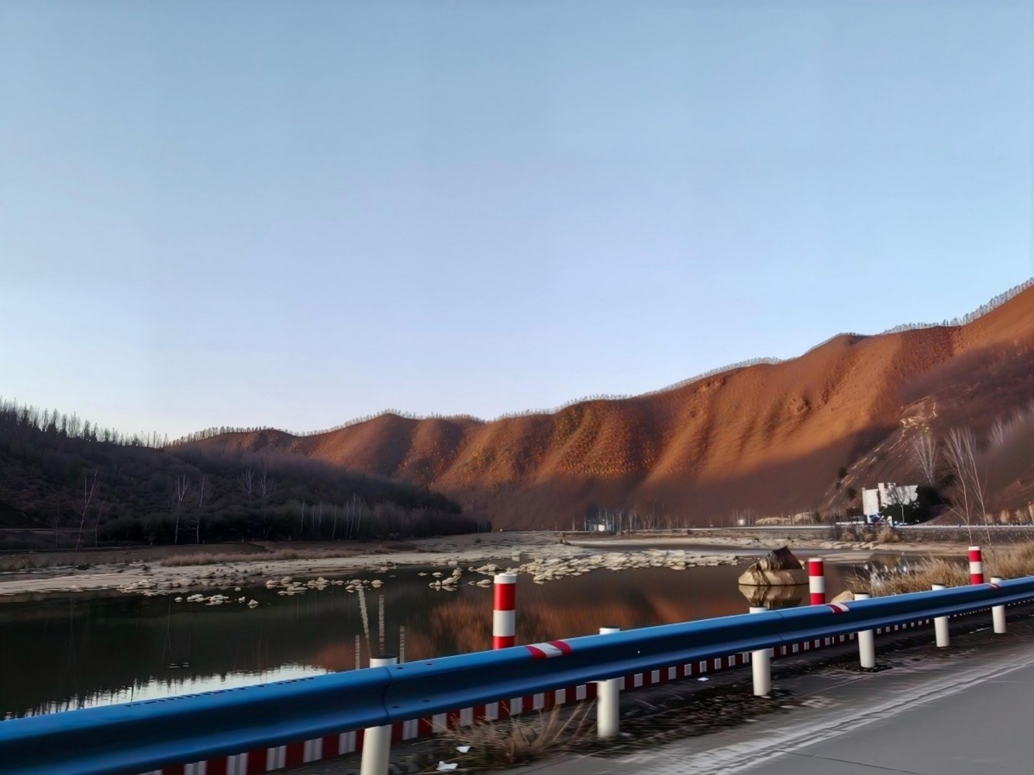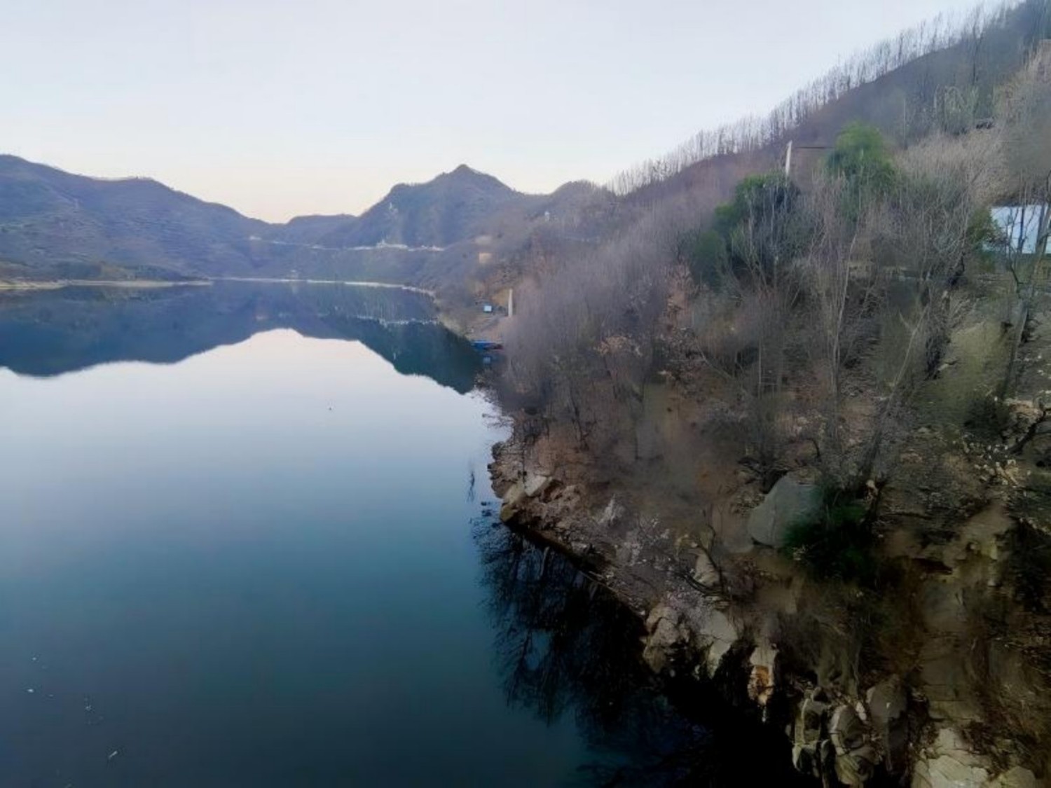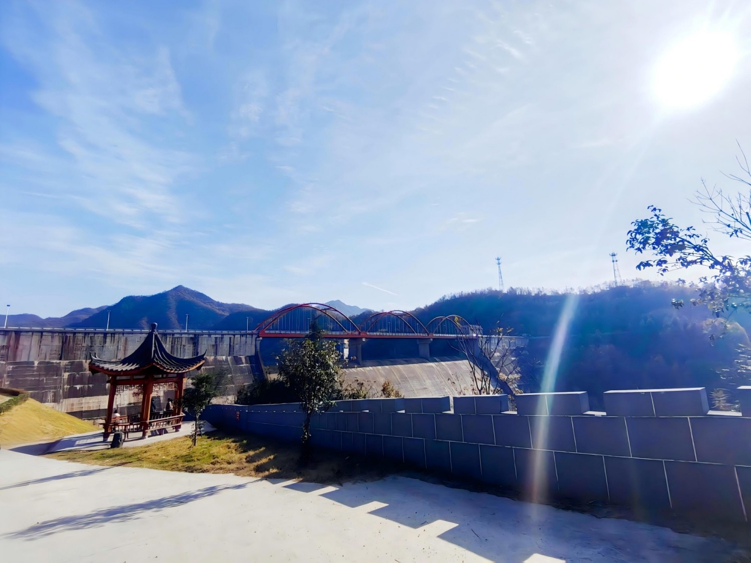 顺着沿河路,穿村落,绕山崖而行,渐次登高。时而可见峡谷河道,时而于树隙间窥见大坝雄姿。经过一段城垛式护墙,沿山崖种植的风物树依然倔强地凝着绿意,油亮着生命力。转过护墙,视野豁然开朗,遂至大坝东侧高岸。