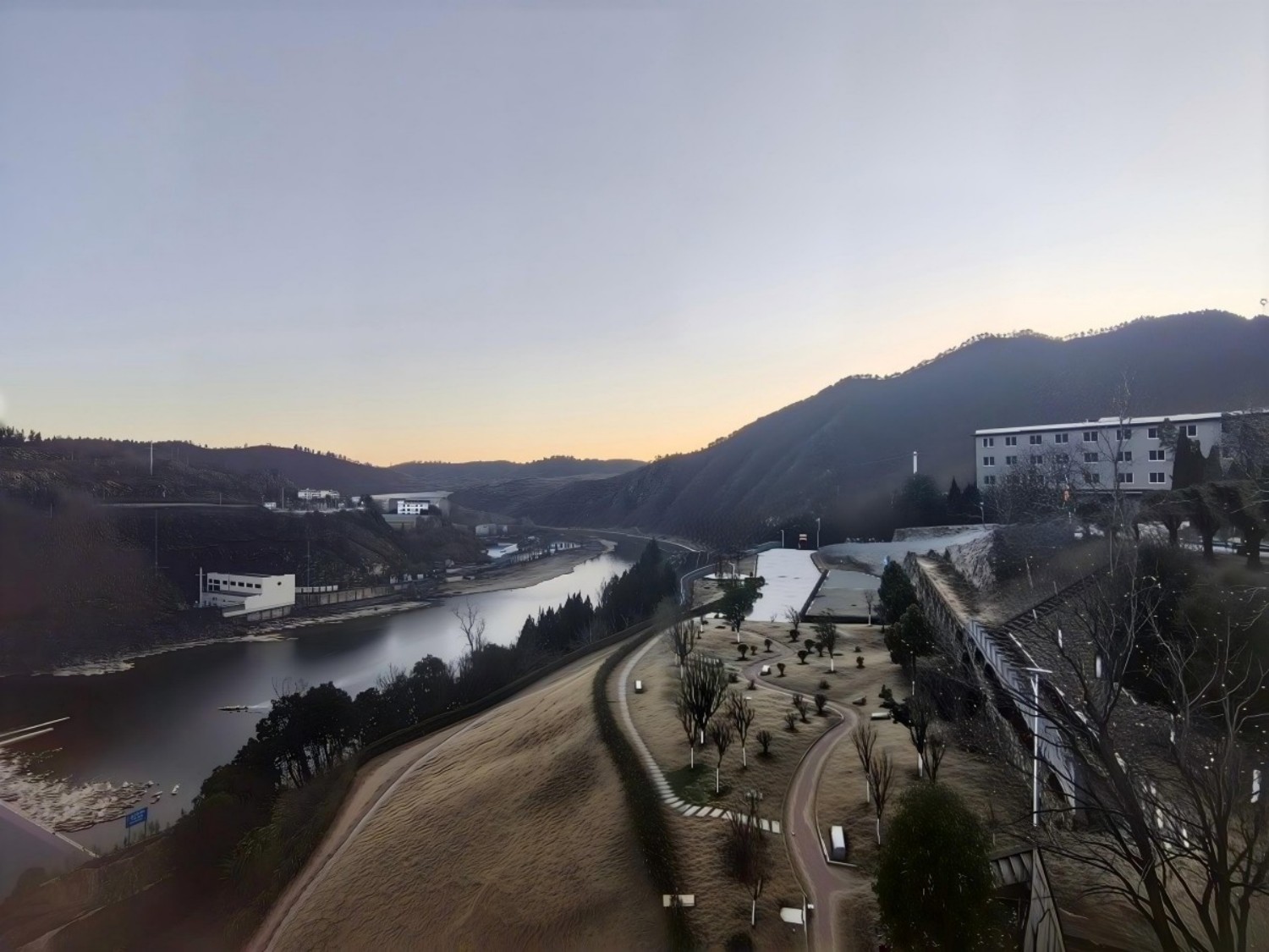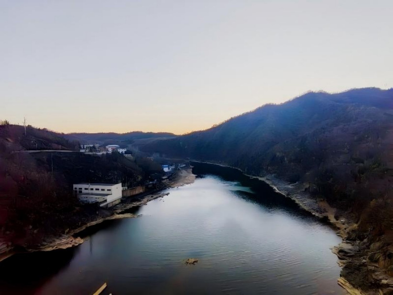 俯视河谷,一湾碧水东流,没有夏日里的激越奔涌,也无春日里的清浅透亮,唯有幽幽默默里的沉静舒缓,漫过河床低坝,坦荡迂曲,消失于群岭转折处。观冬日河水宁静淌远,此处何尝不是一处田园憩息、心境淡然之地。