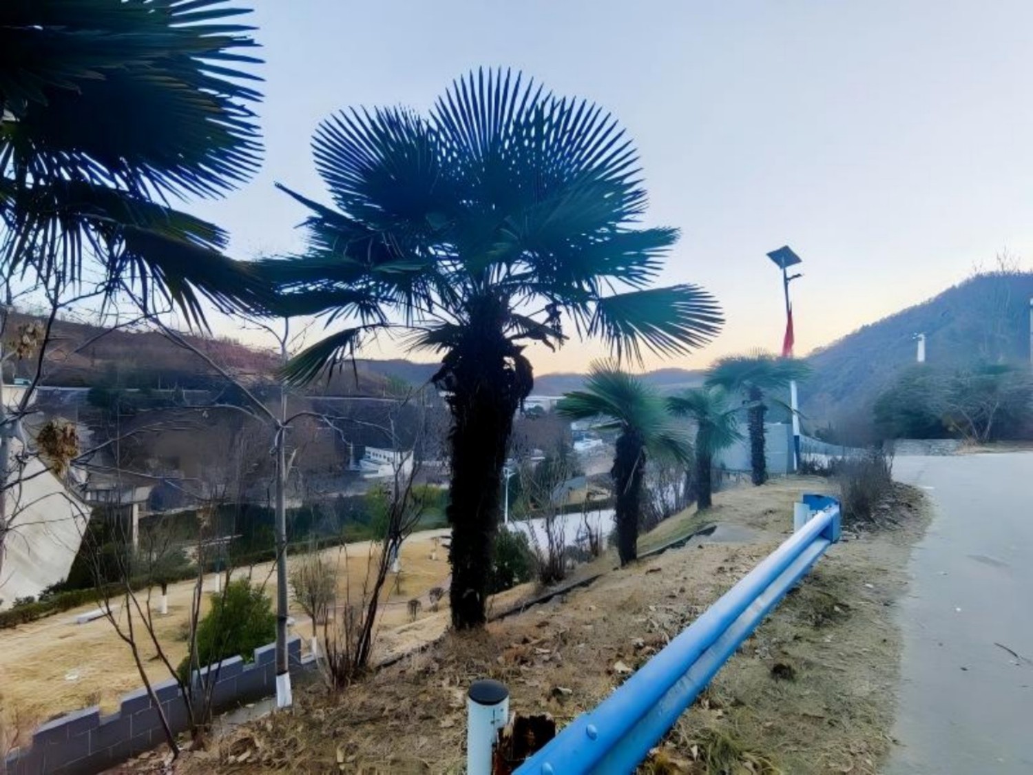 立于坝上回望,冬阳悬空,近岭林木萧疏,道旁松柏犹存深绿,崖壁隙间斜出枯枝,残叶零星,更有秃枝参天,黯然着生机潜隐。任寒风漫过,任霜霰披覆,冬的痕迹烙出了寂寥,刻出了沧桑,亦令人回味四时更迭、兴衰枯荣的自然之道。山坳里,蒿草稀疏,缀着残叶,抖落枯黄,褶续着冷泥,寒潮浸染,凄清弥漫,混着枯草的干香,冷冽而清透,遮掩了生息之声,敛息了万物之鸣。天地荣华暂敛,水泽春色潜藏,唯余冬的凄美。又道是:叶落苔萋霜凝枝,孤阳冷月寂香寒。