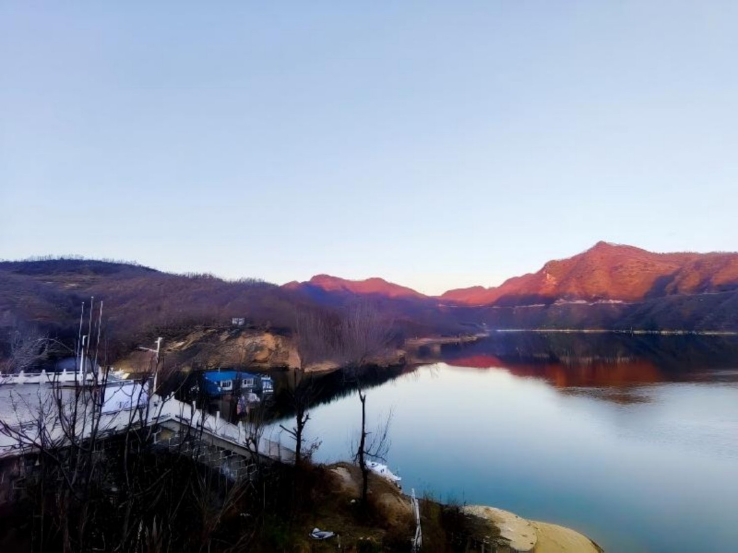 冬日水波,柔婉缠绵,静软深邃。悠然踏阶至小岛而立,四周碧水环抱,天青云疏,夕阳未落西山,新月已挂东天,近处峰顶辉映暖阳,黄叶耀目,红叶灼艳,交杂于枝头,如打翻了的调色盘;低丘处光线不及,更显幽深黛郁。风挟着寒息,笼了地的苍凉,罩了峰的楚绵,又道是:天苍茫、云轻逸,梅傲霜寒疏亭倚;山幽谧、水清漓,冷峰含雾暮阳归。