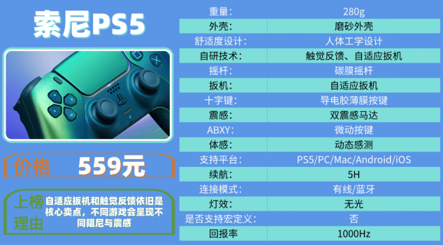 (1)手柄外壳的磨砂触感细腻且防滑,长时间握着也不会觉得手心腻或者累。按键和摇杆布局依旧是索尼那套熟悉的体系,自适应扳机和细腻触觉反馈又是这代手柄最核心的亮点——不同游戏会给你不一样的阻尼与震感,比如赛车里的油门力度、射击时的压枪感,都能被它表现得比较逼真。唯一的小遗憾是,用久了某些自适应场景下阻尼会稍微偏硬一点,触觉反馈在极个别游戏里也会显得有点“过头”,但这种设计在手柄当中还是比较有个性化的。