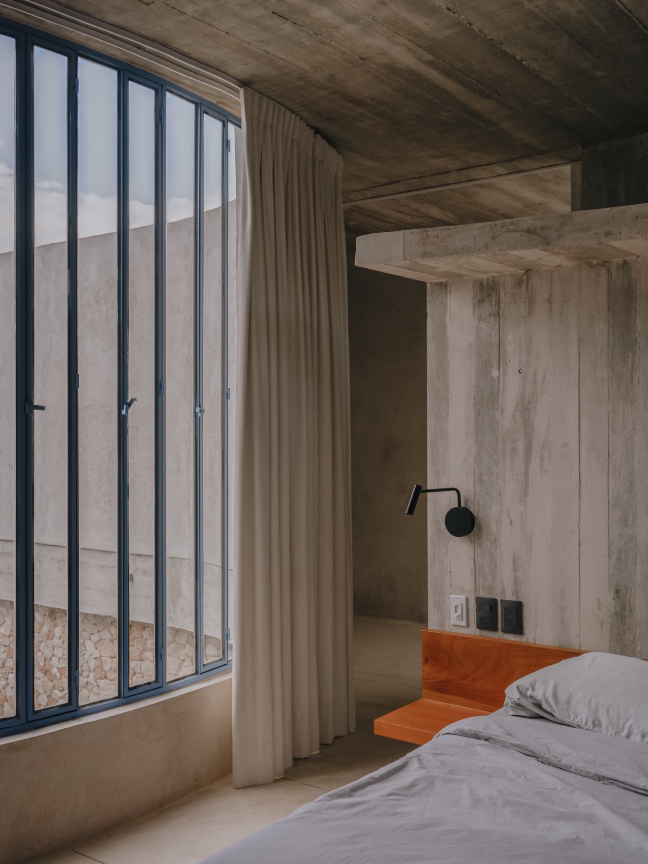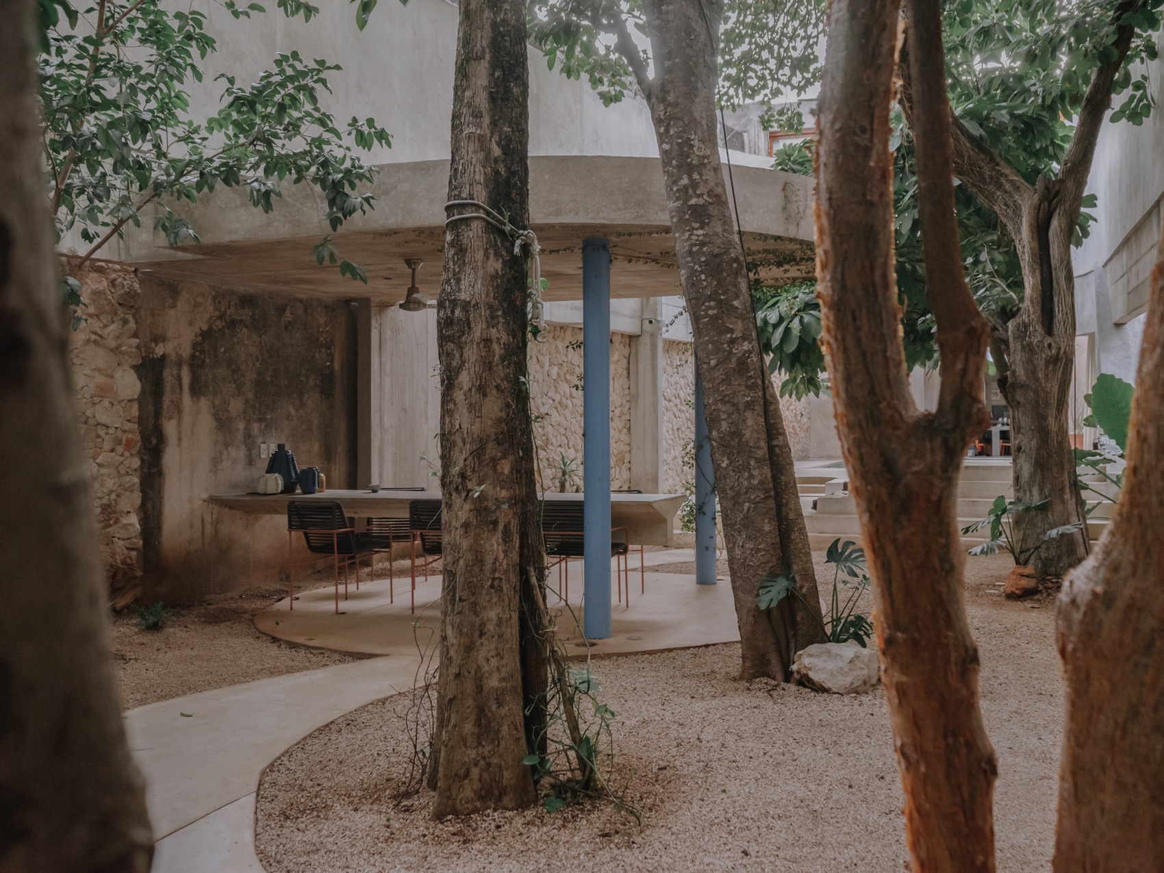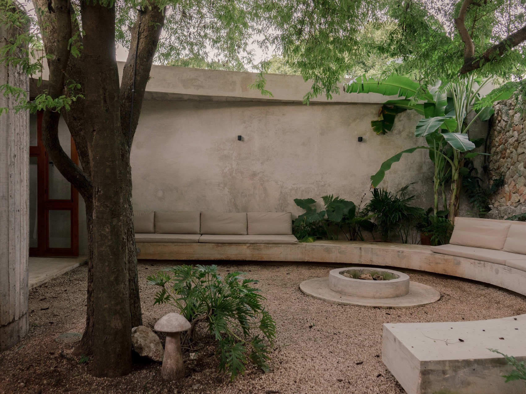 空间设计将这种自然对比转化为策略:前部围绕泳池形成阳光充沛的社交场所,后部则营造出阴凉、静谧的社交与休憩空间。由此,生成两个不同的空间极点,一个属于光与聚集,一个属于阴影与放松,并通过一条穿行花园的路径相连,构成了内部的“绿色肺”。
