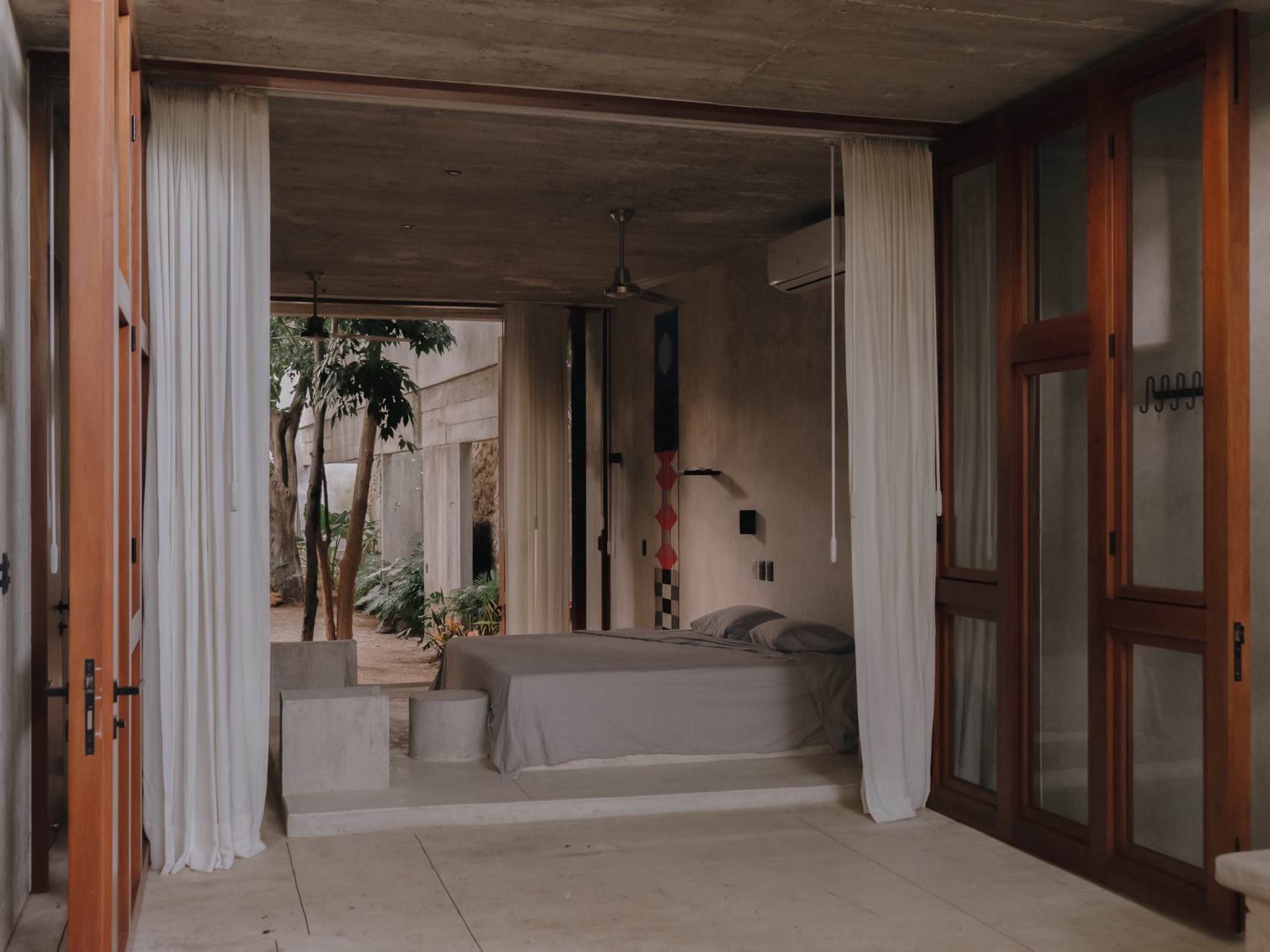 客房设计时室内与室外的界限被消解,花园本身成为完整意义上的起居空间。在这种回应场地自然条件的布局中,传统的空间组织被彻底解构。而卧室则如同树屋般,被嵌入到既有树木之间。