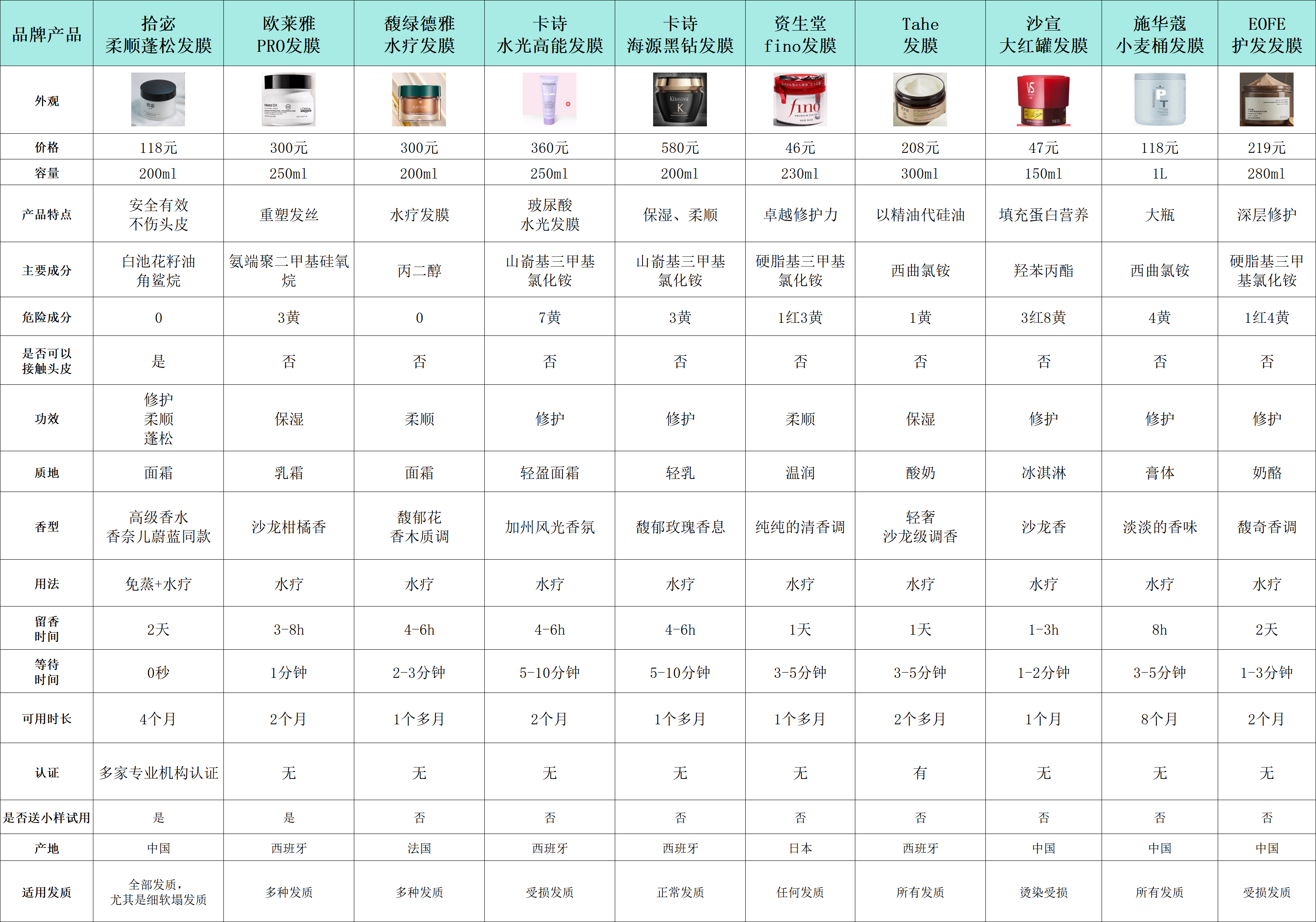 我先公开一下这十款发膜的简单测评数据,以便大家能够对它们有一个基本的了解。