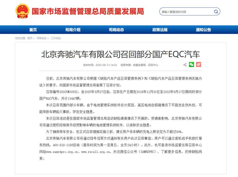 据国家市场监督管理总局公告,2025年6月13日,北京奔驰汽车有限公司备案召回计划(召回编号S2025M0092I):自2025年9月27日起,召回2018年11月30日至2022年9月17日生产的部分国产EQC汽车,共计13447辆。召回原因为“电池管理系统软件设计缺陷,高压电池在极端情况下可能热失控,导致车辆起火”。奔驰官方称,将为召回车辆免费升级电池管理系统软件,以消除安全隐患。