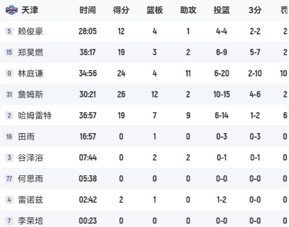 上方截图是本场比赛天津男篮的数据,首发五人:詹姆斯登场30分31秒,拿到26分12板2助,林庭谦登场34分56秒,拿到24分4板11助。哈姆雷特登场36分57秒,拿到19分7板9助,郑昊燃登场36分17秒,拿到19分3板2助,赖俊豪登场28分05秒,拿到12分4板1助2断。