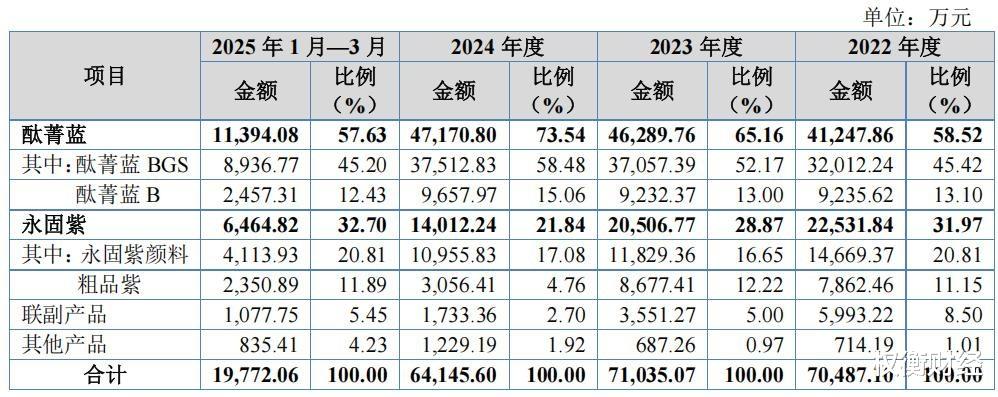 报告期内,申兰华的主营业务产品由酞菁蓝产品、永固紫产品、联副产品及其他产品构成。酞菁蓝销售占比分别为58.52%、65.16%、73.54%和57.63%,永固紫销售占比分别为31.97%、28.87%、21.84和32.70%。