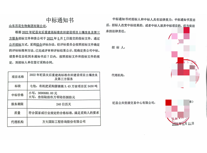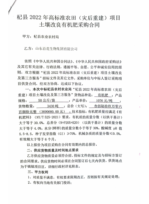 2022 年 5 月,经公开招标,百花生物成功中标杞县农业农村局主导的 “2022 年高标准农田(灾后重建)项目土壤改良有机肥采购”项目,并于 5 月 12 日签订正式采购合同。合同明确约定:供应规格为 50 公斤/袋的有机肥3430 吨,单价1076元/吨,总金额3690680元;产品质量需严格符合《有机肥料》(NY/T525-2021)国家标准,有机质≥30.0%、总养分≥4.0%、种子发芽指数≥70% 等指标均有硬性要求。