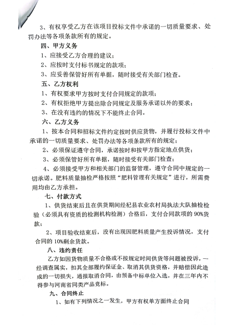 合同同时明确供货与付款义务:签订后 7 日内完成供货,交货地点为于镇镇项目区;供货结束且经杞县农业农村局执法大队抽检合格后支付 90% 货款,项目验收无质量投诉后支付剩余 10%。百花生物克服原料涨价、运输紧张等压力,按时完成全部配送,每批次货物均经甲方现场验收确认,第三方检测报告显示所有指标达标。2023年初,项目通过相关部门整体竣工验收,无任何质量投诉,已完全满足全额付款条件。