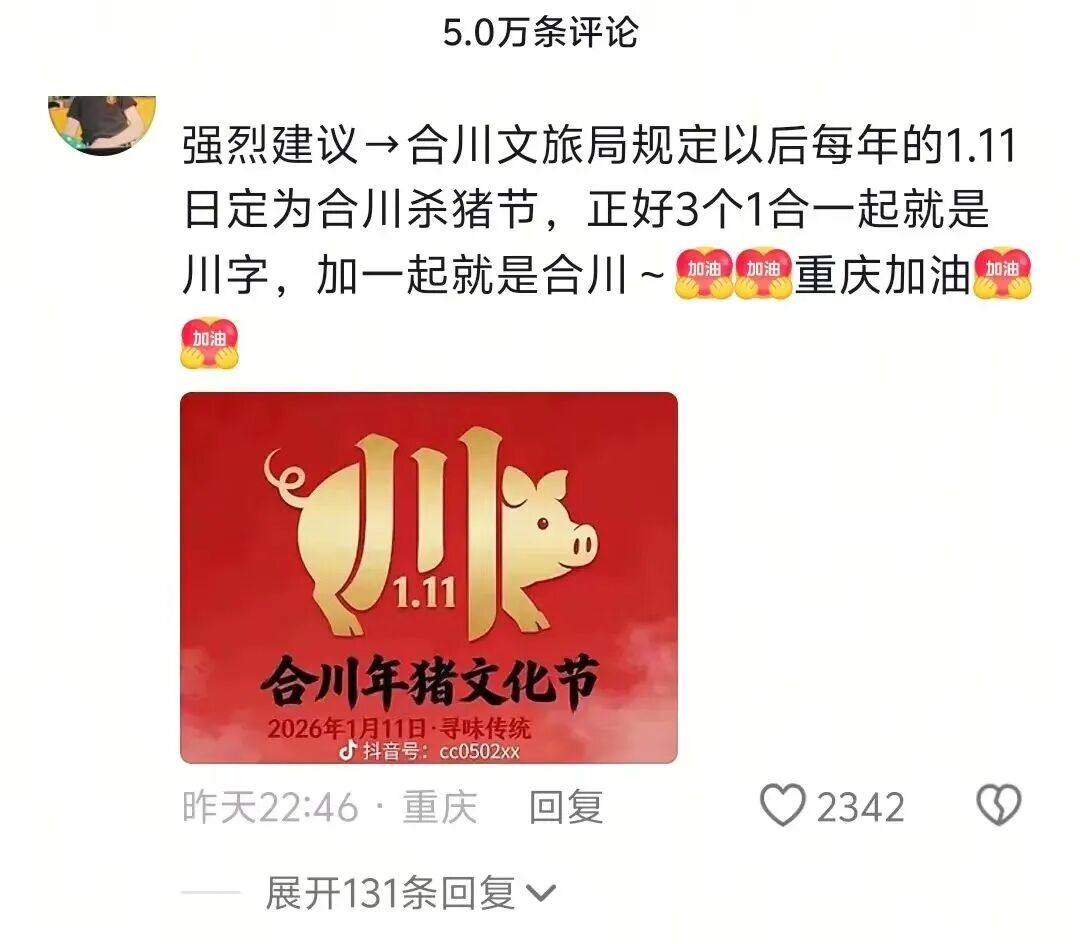 流量的瞬间爆发只是起点,如何将“泼天流量”转化为“长效留量”,是所有网红文旅事件的关键命题。此次爆火中,不少网友留言建议将每年1月11日设为“杀猪节”,巧妙借三个“1”合为“川”的字形创意呼应“合川”地名,这一充满民间智慧的提议,不仅精准契合乡土节庆的文化内涵,更为民俗IP的长效运营提供了绝佳的切入点。