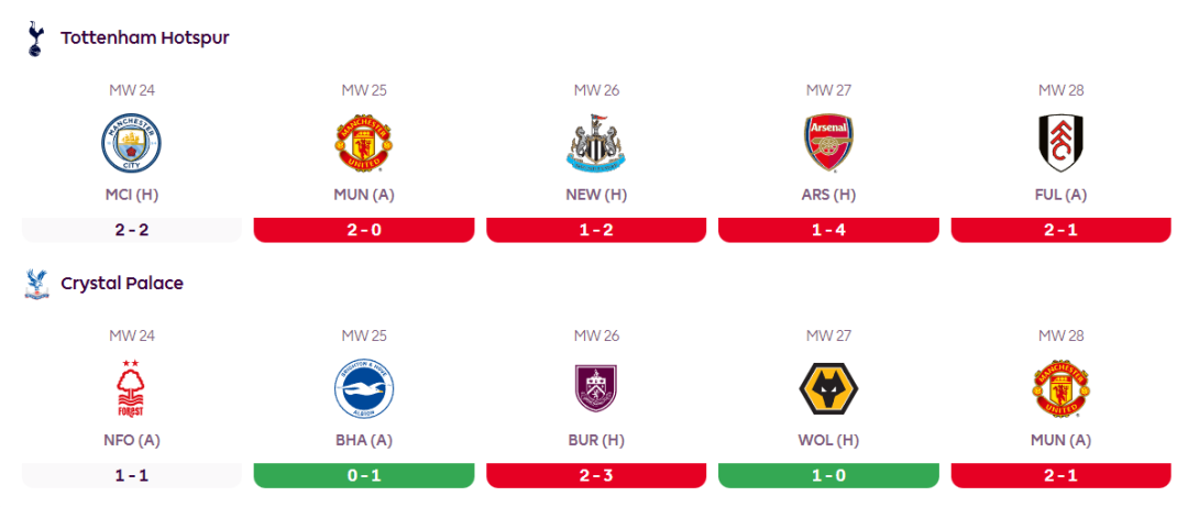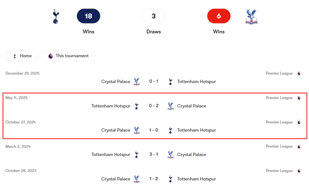 两队近12次英超交锋,热刺8胜2平2负占据历史优势,但近期交锋格局已发生逆转。上赛季水晶宫完成对热刺的“双杀”,客场2-0零封获胜,主场1-0小胜,队史首次在顶级联赛单赛季双杀热刺,给热刺球员留下严重的心理阴影。本赛季首回合,热刺客场1-0小胜但赢得侥幸,水晶宫全场反击威胁更甚,只是缺乏临门一脚的效率。